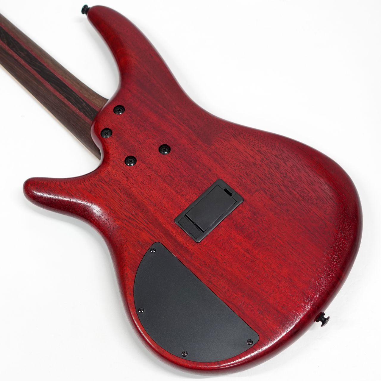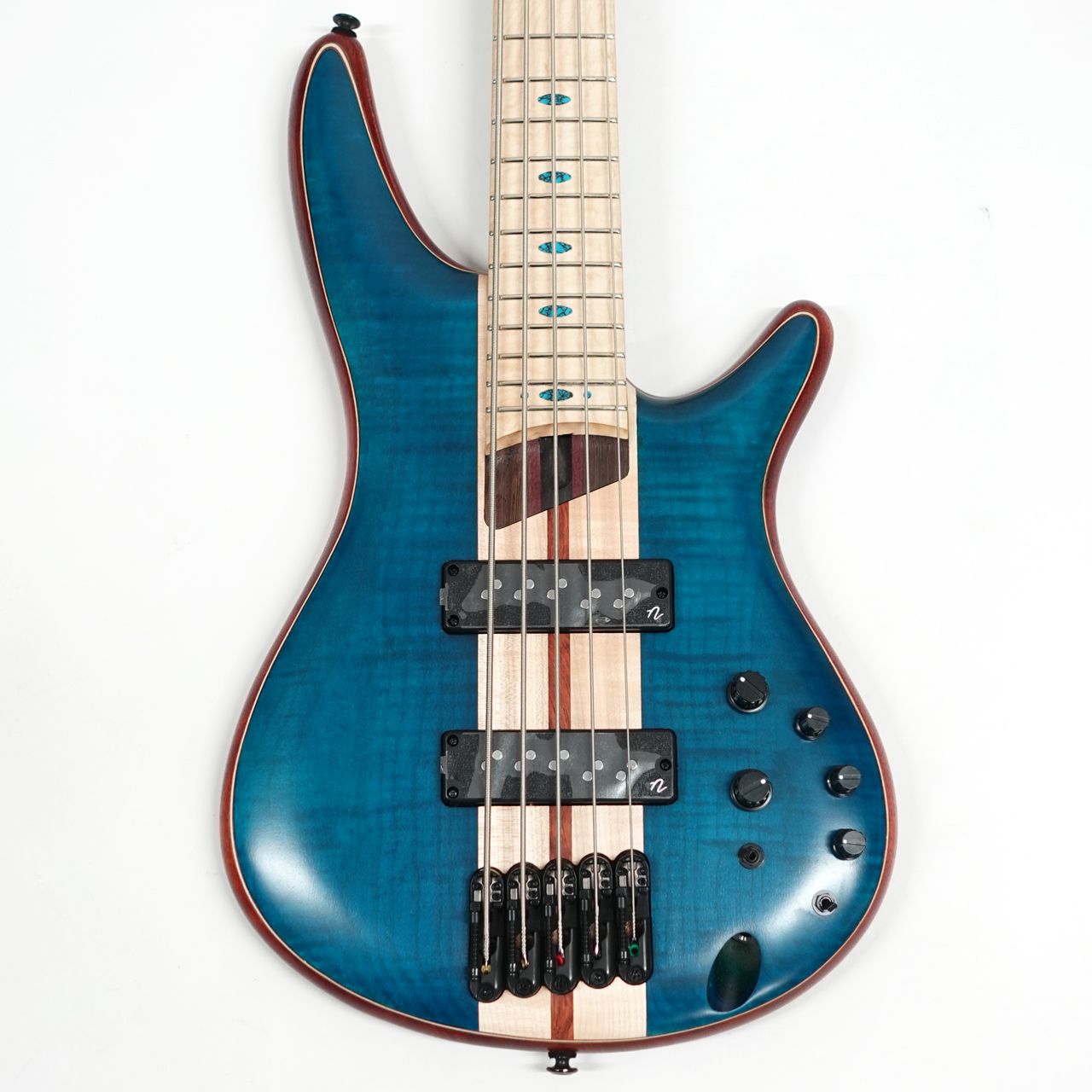 本機はフレイムメイプルトップとアフリカンマホガニーバック、メイプル指板でウッディなルックスが好印象なSR5弦モデル。