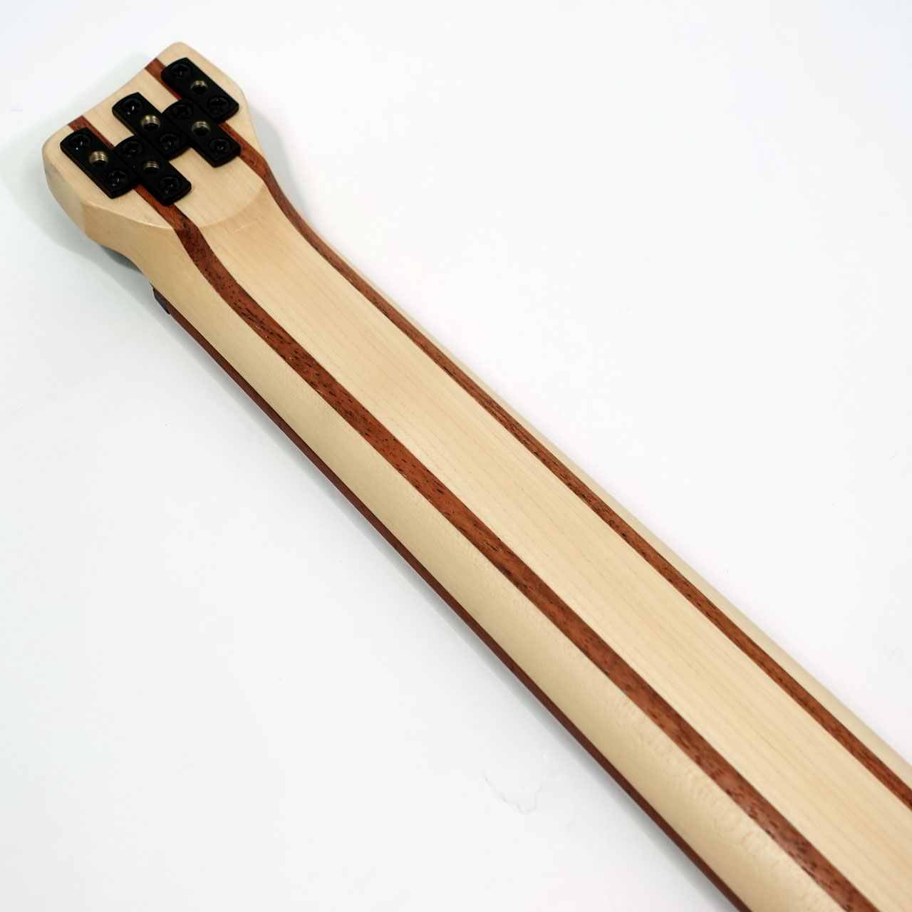 裏側から6角レンチで回すことで、簡単に弦をセット&リリース可能で、軽量且つ堅牢、さらにシンプルなデザインで仕上げた専用のヘッドピースです。