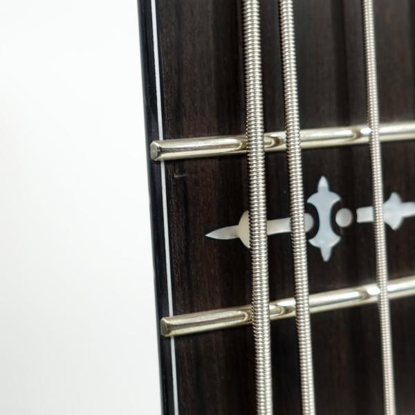 キルトメイプルトップにマホガニーボディ、スルーネック構造や特徴的なインレイ、豪華なバインディングなど、こだわりが随所に見られる一本となっています。