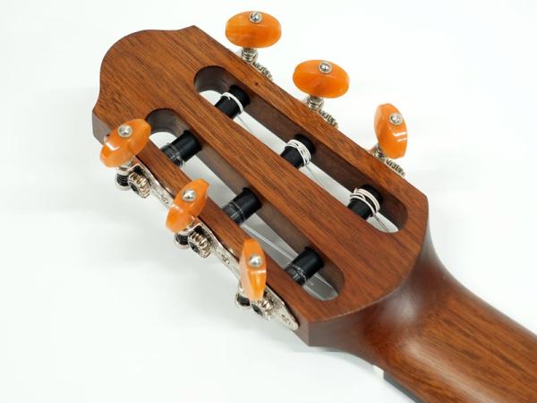 小さなボディはライブやストリートでも持ち運びやすさや取り回しのよさは威力を発揮します。もちろんハウリングにも断然強い!です。またナイロン弦仕様のこのモデルにもトラスロッドを採用。ネックを最適な状態に調整出来ます。