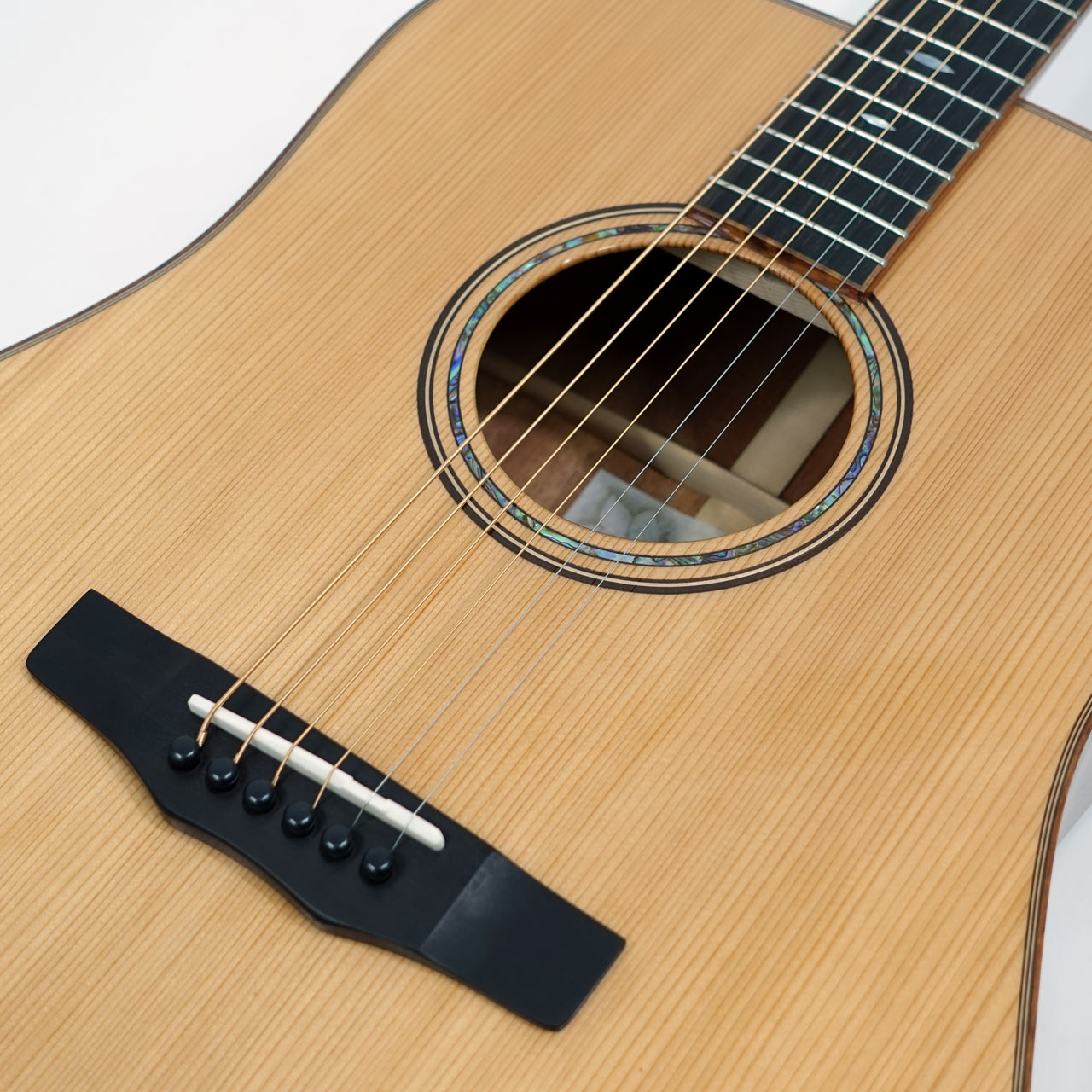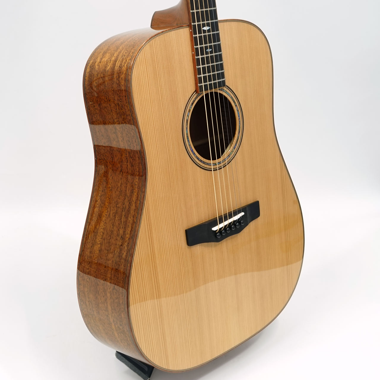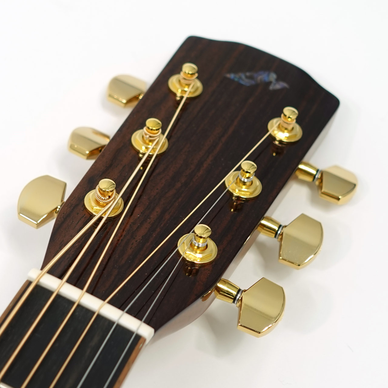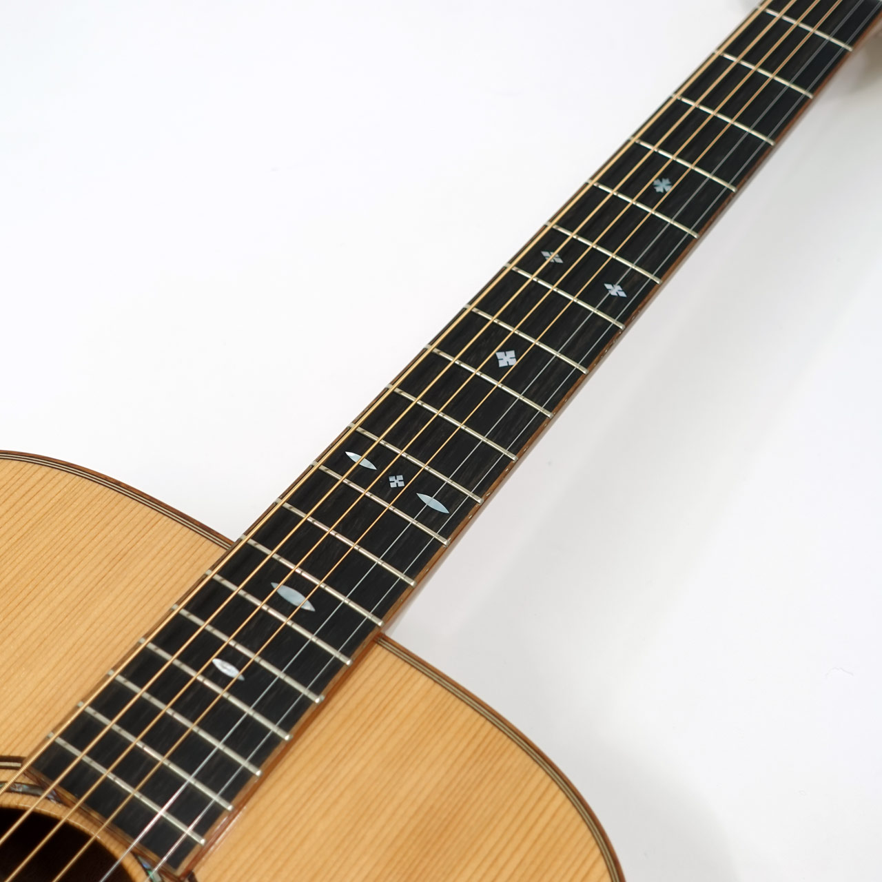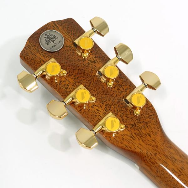 シンプルなスノーフレーク・ポジションマークやウッディなバインディングなど落ち着きのあるルックスに仕上がっています。その他エボニー指板・サドルや牛骨ナット、サドル、GOTOH製のペグなどスペックも上々。
