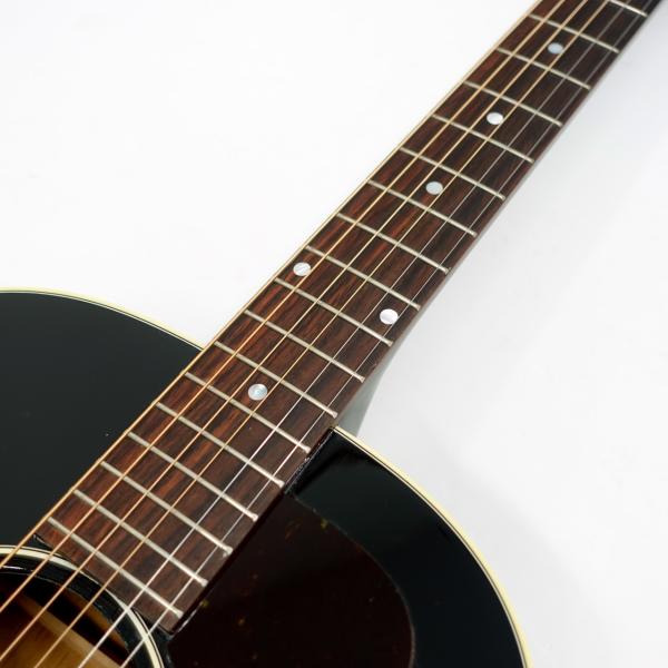 トップ材はシトカスプルースにサイド&バック材はマホガニー、マホガニー材ネック(ラウンドネック)、牛骨ナット&サドル、、Grover 3連ペグ(クリームボタン)チューナー、ボーンサドル&アッパーベリーブリッジ、少しアンティーク色がかった処理のバインディングやトーティスのラージピックガードで雰囲気抜群です。