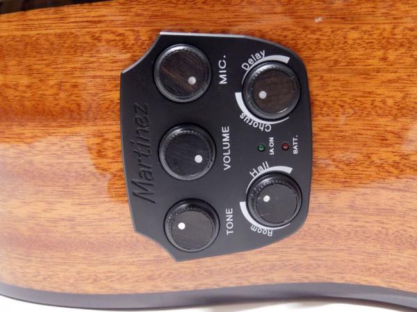 プリアンプ部分にコンデンサマイクを搭載し、アンダーサドルのピエゾとブレンドして非常にナチュラルなマイク録りに近いラインサウンドを出力。この価格帯とは思えないほどそのまま使えるサウンドです。さらに4種類のエフェクターを内蔵し、ボディバックに取り付けられたレゾナンススピーカーから生音に直接リバーブやコーラス、ディレイまでかけることができ、アンプやスピーカーが無くてもエフェクトありの演奏が可能です。勿論ライン出力にエフェクトをかけることも可能です!