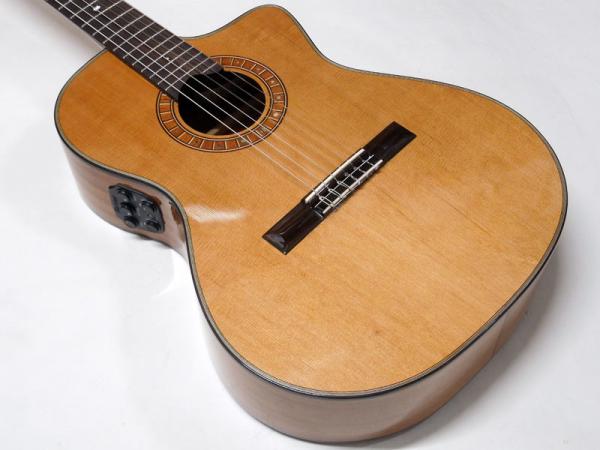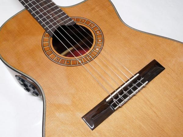 レッドシダー単板トップ、サイド&バックにはマホガニーを採用。マホガニーネックにエボニー指板、ローズウッドブリッジ、サウンドホールのロゼッタはクラシックギターらしいルックスですが、14フレットジョイント、カッタウェイ付き。