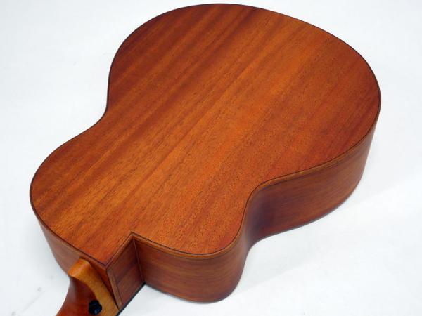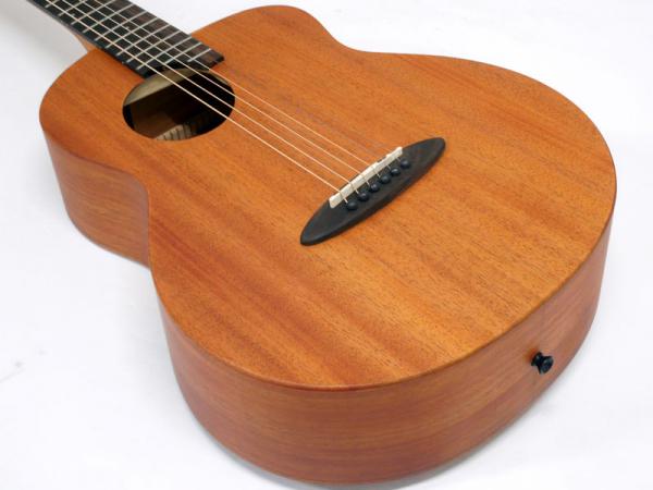 こちらはマホガニー単板トップ、マホガニー材サイド&バック、マホガニー材ネック、ローズウッド材指板&駒、牛骨ナット&サドル、44mmナット幅、610mmスケール、艶消しマットフィニッシュとワンランク上の作りの良さ、豊かな音色が特徴です。