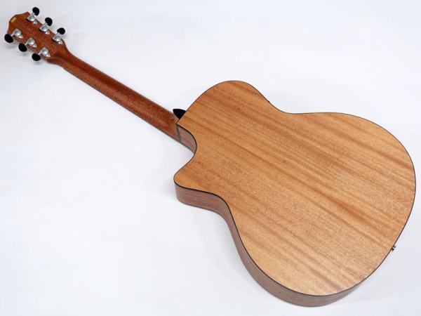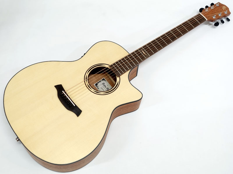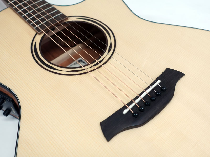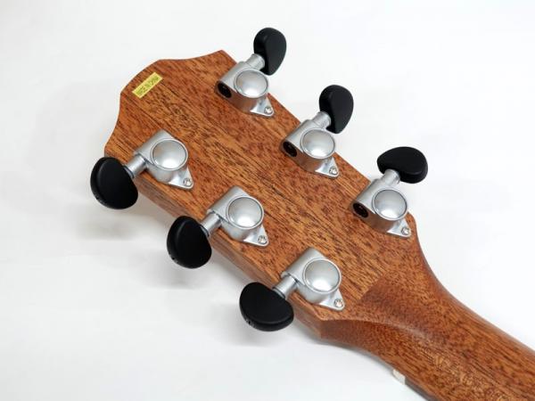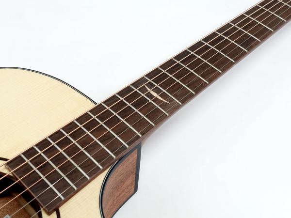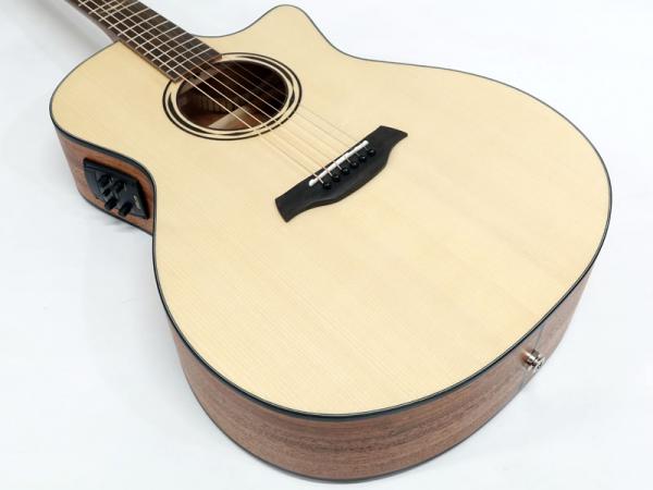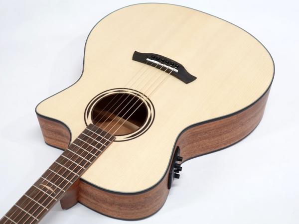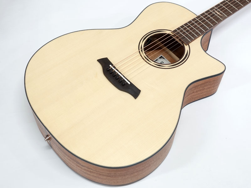 ジャーマンスプルース単板トップ、マホガニーサイド&バック、マホガニーネック、オバンコール指板&駒。弾きやすい薄めのネックに43mmナット幅でフィンガースタイルでも弾きやすいプレイアビリティを持ちます。軽快な箱鳴り感は価格以上のクオリティが感じられます。