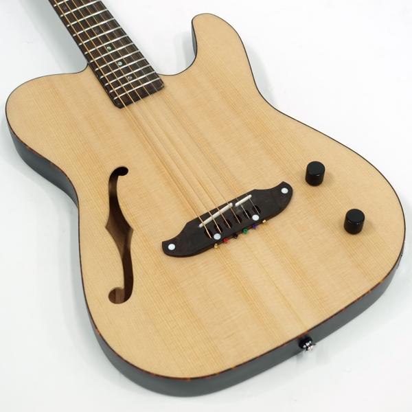 マホガニーをくり抜いたボディにスプルーストップのシンラインのような構造ですがアコースティックな響きの箱鳴り感は十分にあり、小振りなボディのレスポンスの良さは家弾きなどでも音量のコントロールがしやすく非常に弾きやすいです。重量も非常に軽く、音量の迫力はドレッド等に比べて弱いですが、この機種ならではのストレスのない演奏性は魅力です。