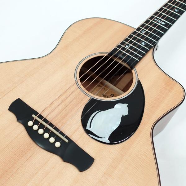 こちらのギターはナターシャ・ギターを代表するボディ形状を持ったJCシリーズ。モデル名が示すように、猫のシンボルが特徴のCAT。基本的なスペックはJC-1同じで、見た目のファンシーさとは裏腹にサウンドとクオリティはトップクラス。JC-1との違いは、ヘッドと指板に施された猫をモチーフとしたインレイです。猫のシルエットが入ったピックガードは付属品として付いてきますので、購入後にプレイヤーの好みで、有無を選べます。