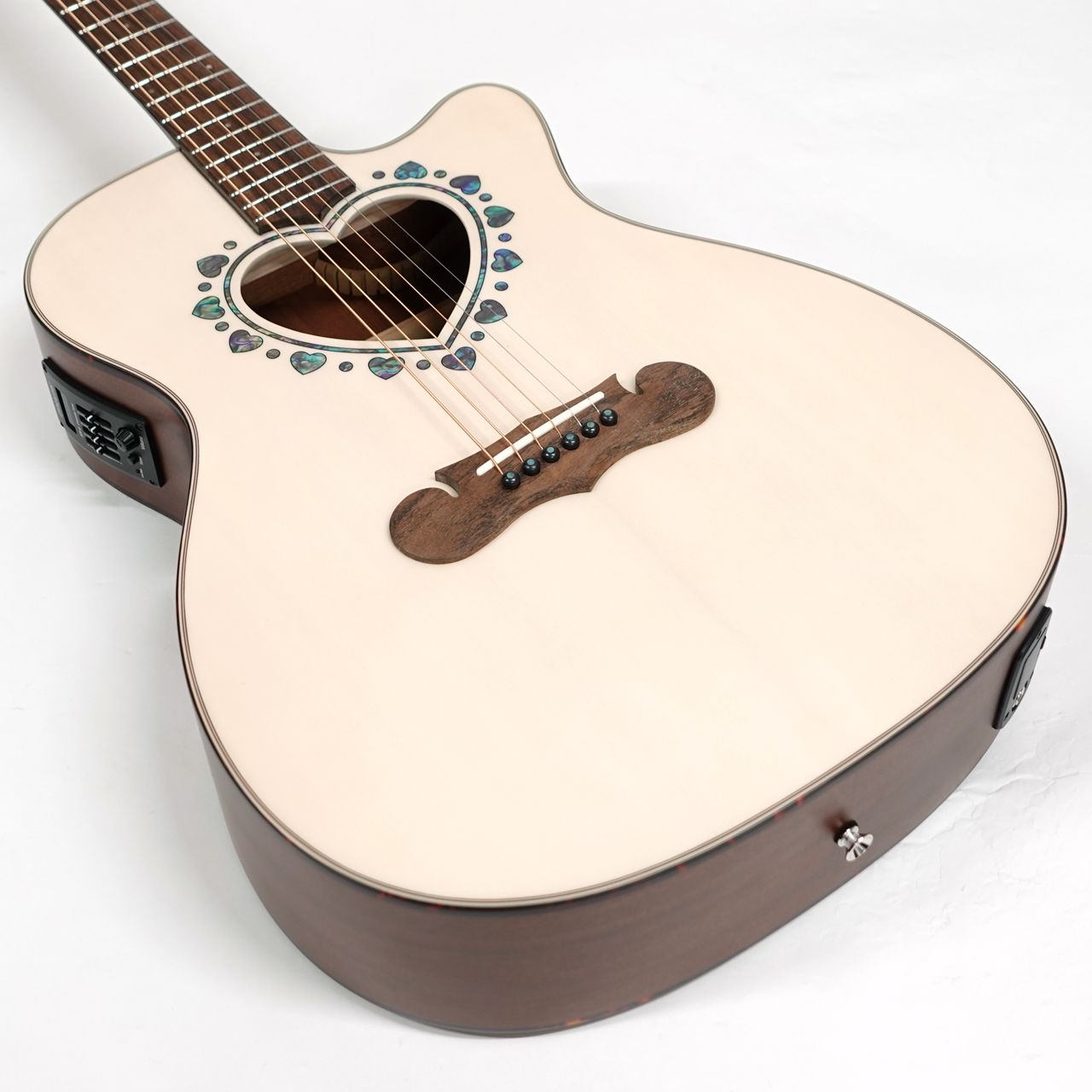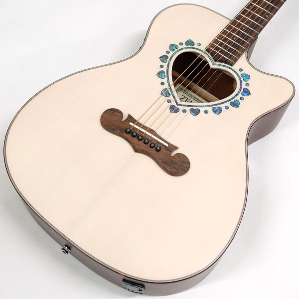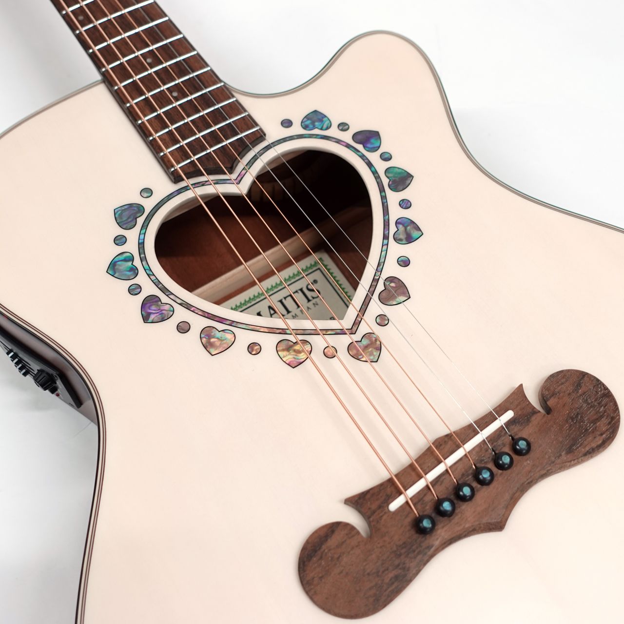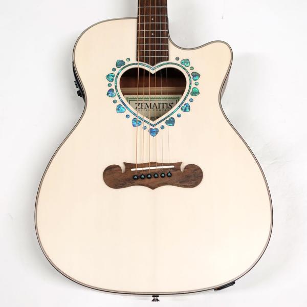 ゼマイティスの伝統的なハート型のサウンドホールの周りに特徴的なハートをちりばめたデザインとマスターシュ・ブリッジのオリジナル・デザインはゼマティスならでは。