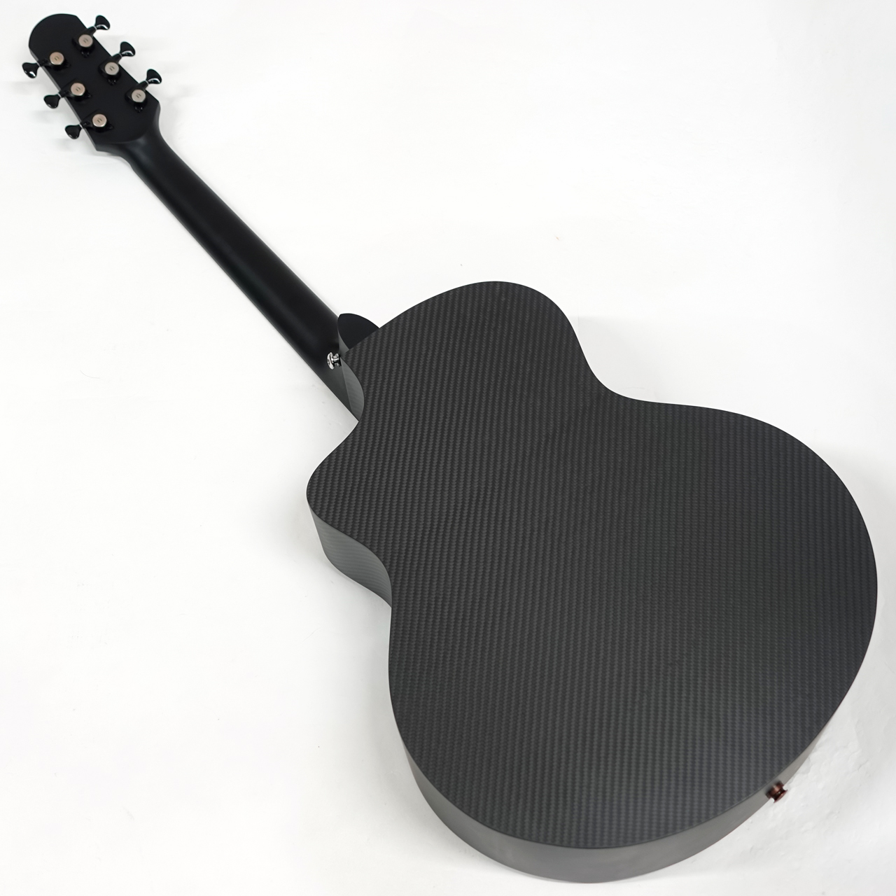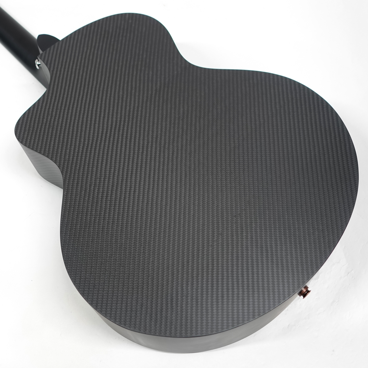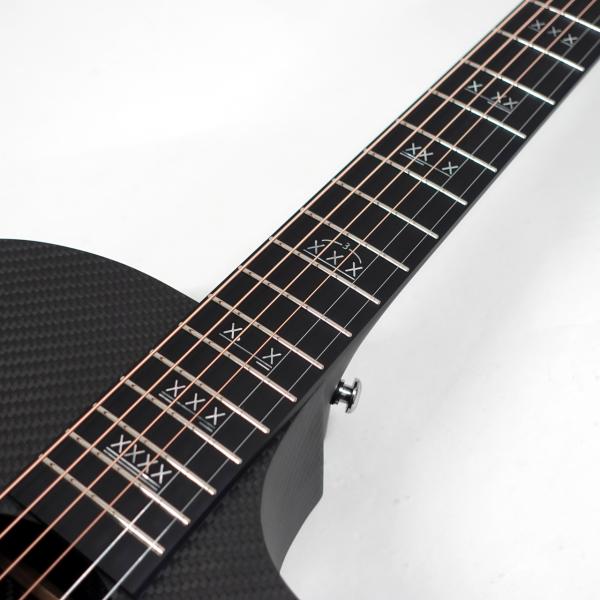 こちらのギターは新開発の3Kカーボンファイバー・ボディを採用。振動減衰が非常に低いため、音の伝達が機敏でクリア。音色を決定するブレイシングは木製で、カーボンファイバーとの完璧な融合により、シャープで豊かな倍音のサウンドを実現しています。