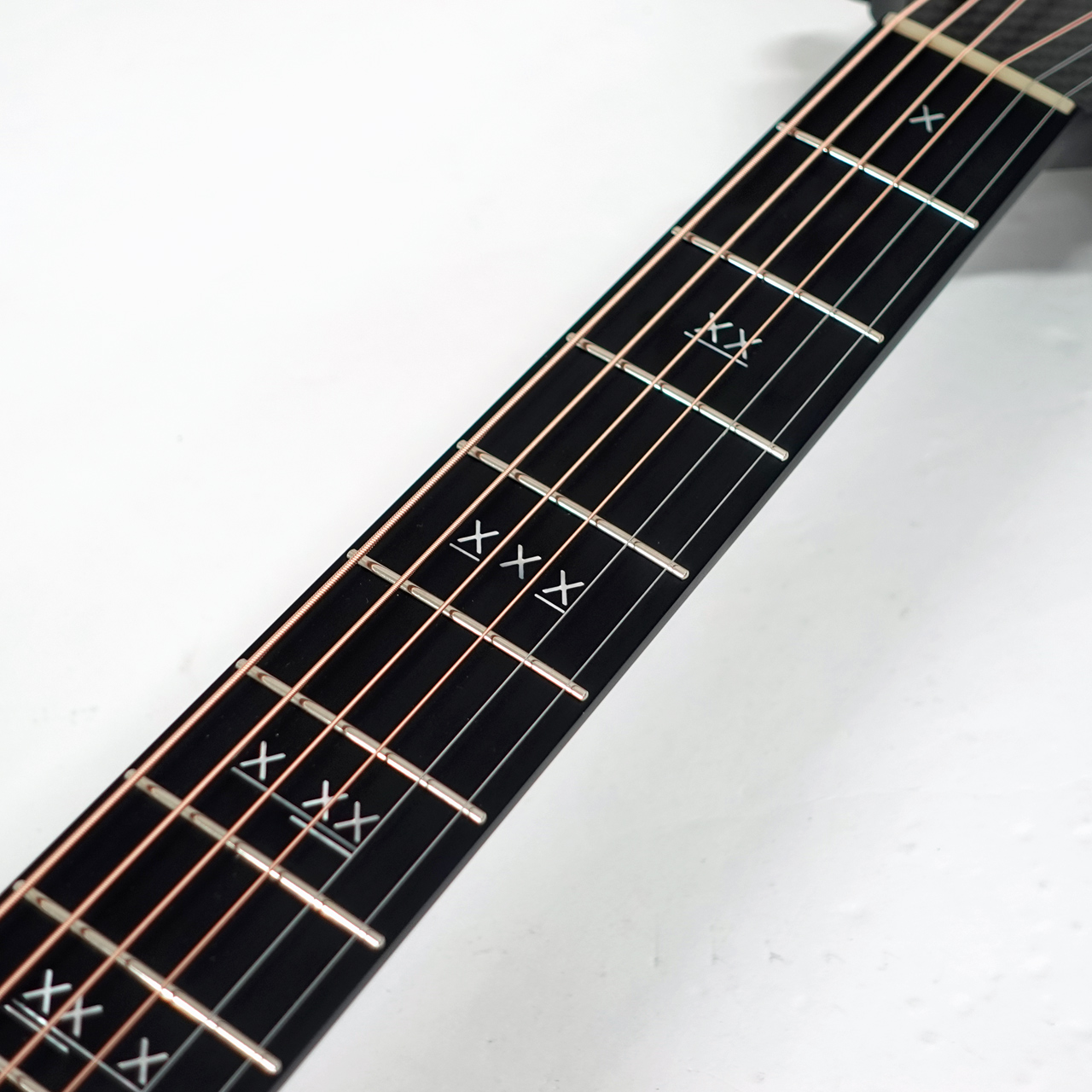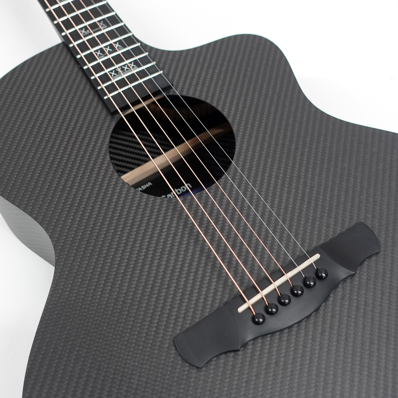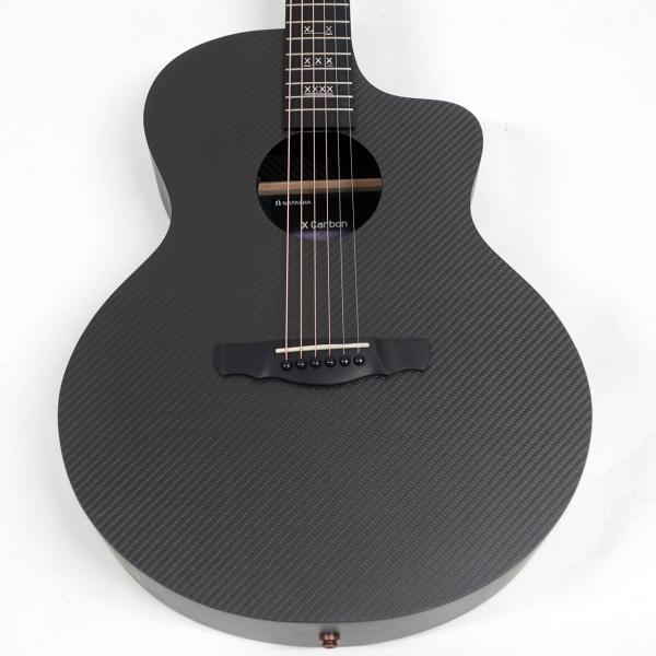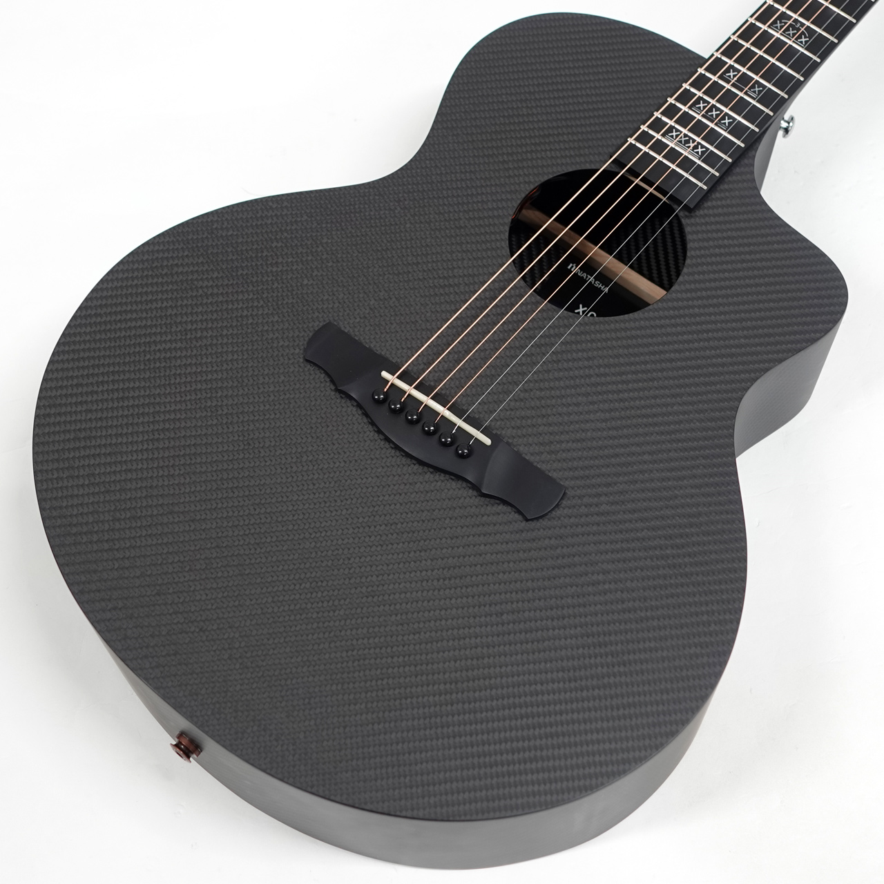 こちらのギターは新開発の3Kカーボンファイバー・ボディを採用。振動減衰が非常に低いため、音の伝達が機敏でクリア。音色を決定するブレイシングは木製で、カーボンファイバーとの完璧な融合により、シャープで豊かな倍音のサウンドを実現しています。