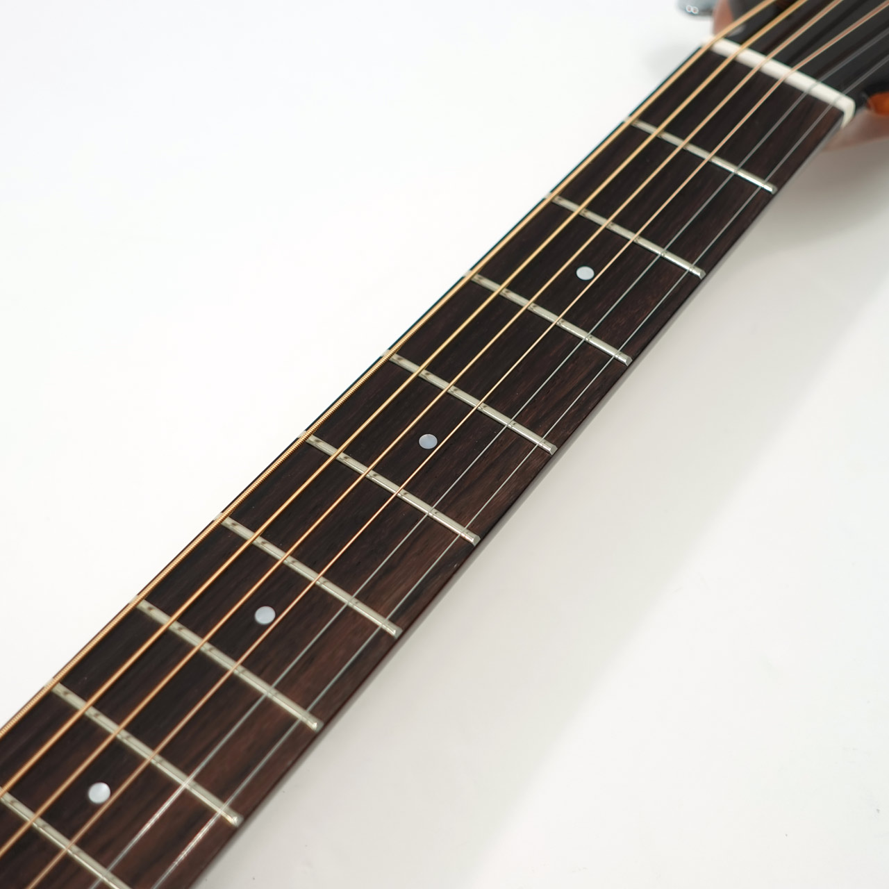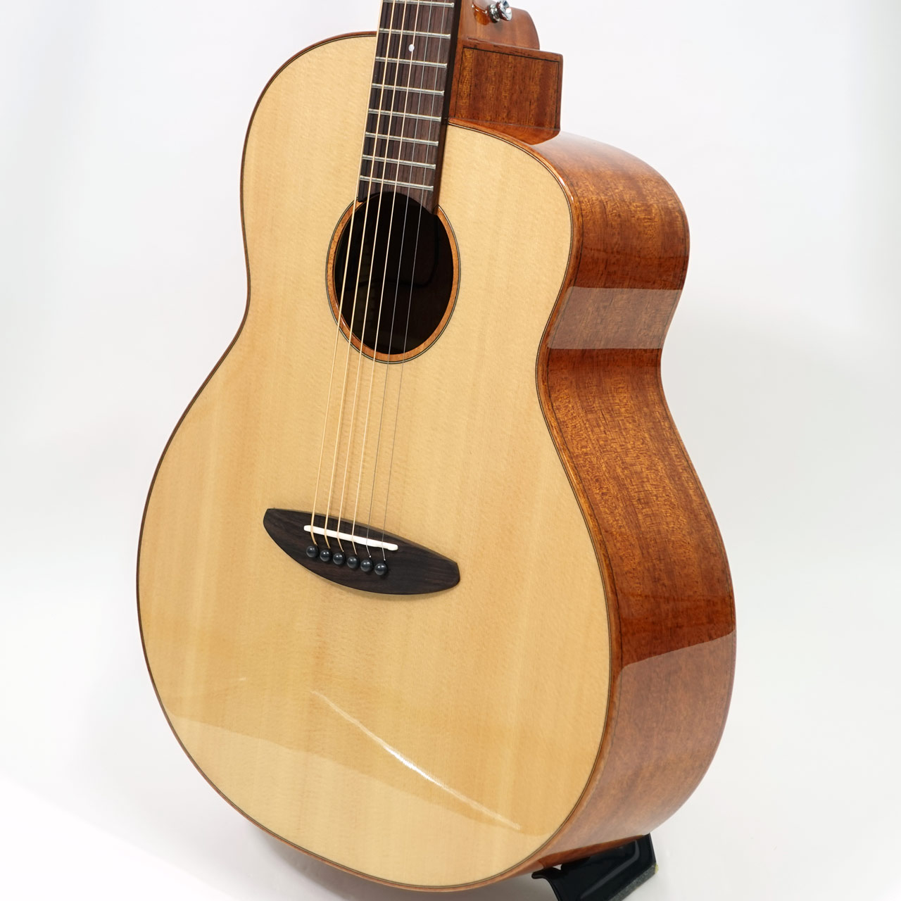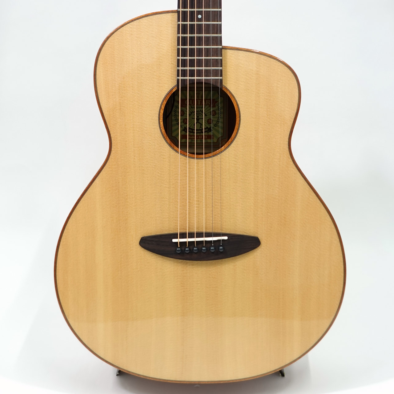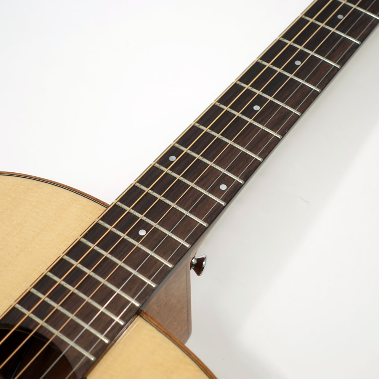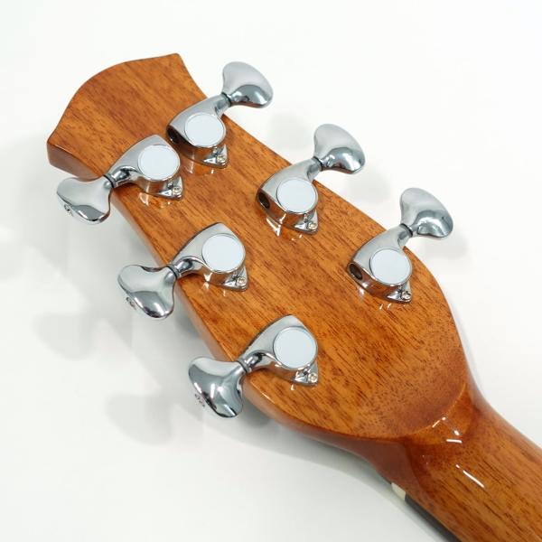 スペックはオーソドックスなスプルース単板トップ、マホガニー材サイド&バック、マホガニー材ネック、ローズウッド材指板&駒、牛骨ナット&サドル、44mmナット幅、650mmスケール、グロス・ボディ&グロス・ネック、Air Blueピックアップ搭載となっております。ロゴなしのヘッドは杉田健司氏デザインのハンドカットヘッドストックを採用し、この価格帯とは思えないハイエンドギターのような高級感があります。
