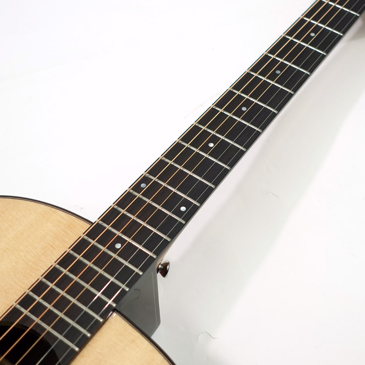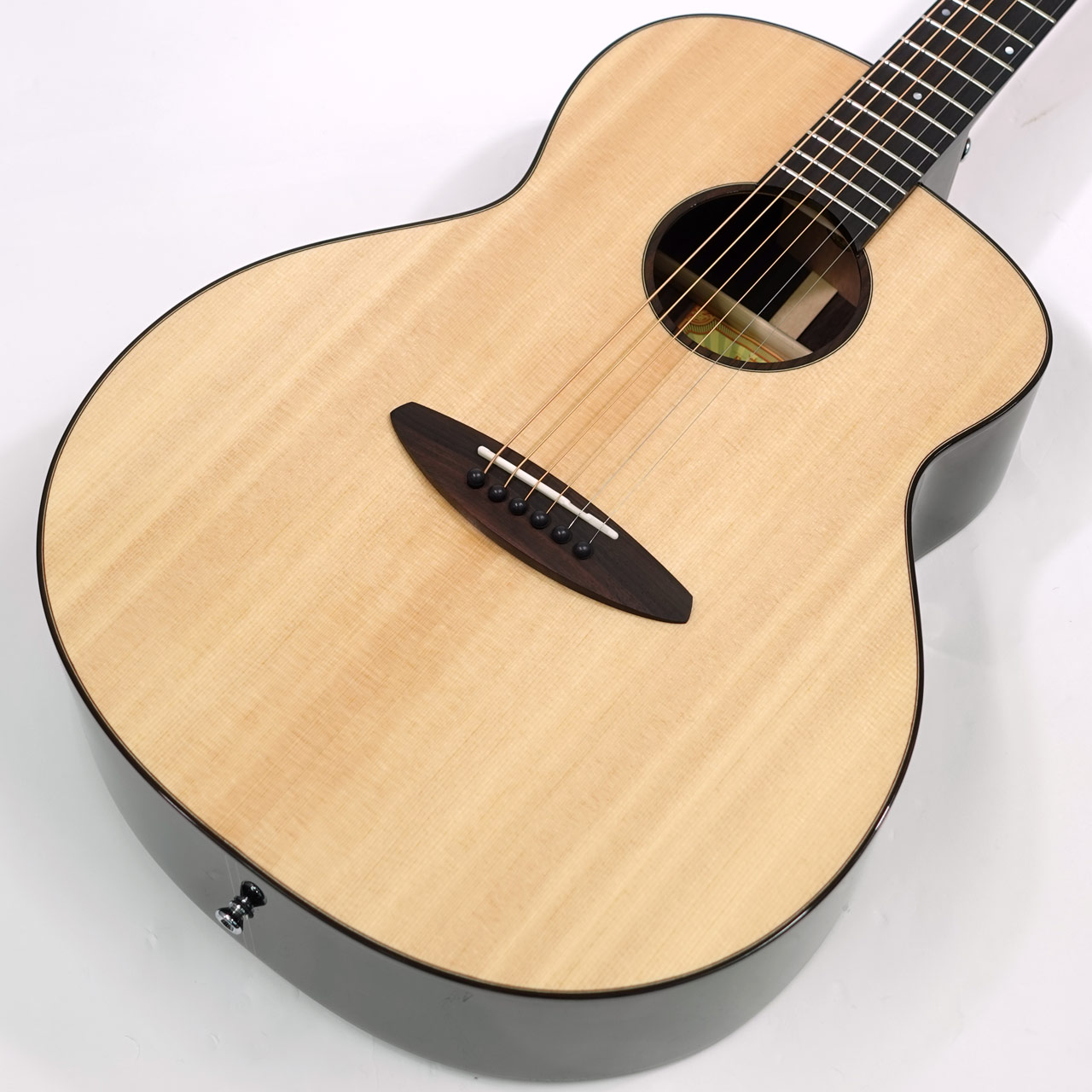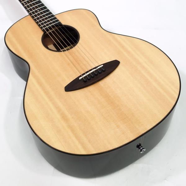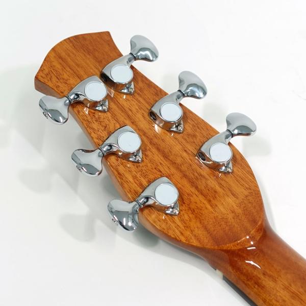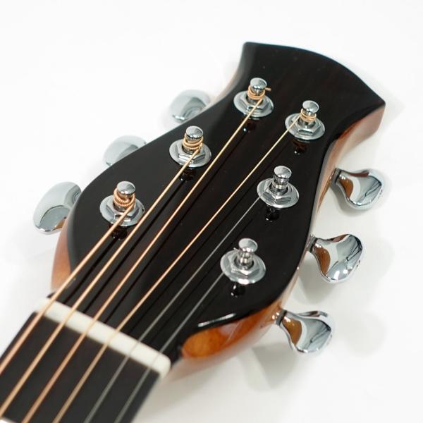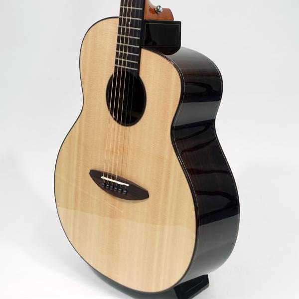 スペックはオーソドックスなスプルース単板トップ、ローズウッド材サイド&バック、マホガニー材ネック、ローズウッド材指板&駒、牛骨ナット&サドル、44mmナット幅、650mmスケール、グロス・ボディ&グロス・ネック、Air Blueピックアップ搭載となっております。ロゴなしのヘッドは杉田健司氏デザインのハンドカットヘッドストックを採用し、この価格帯とは思えないハイエンドギターのような高級感があります。