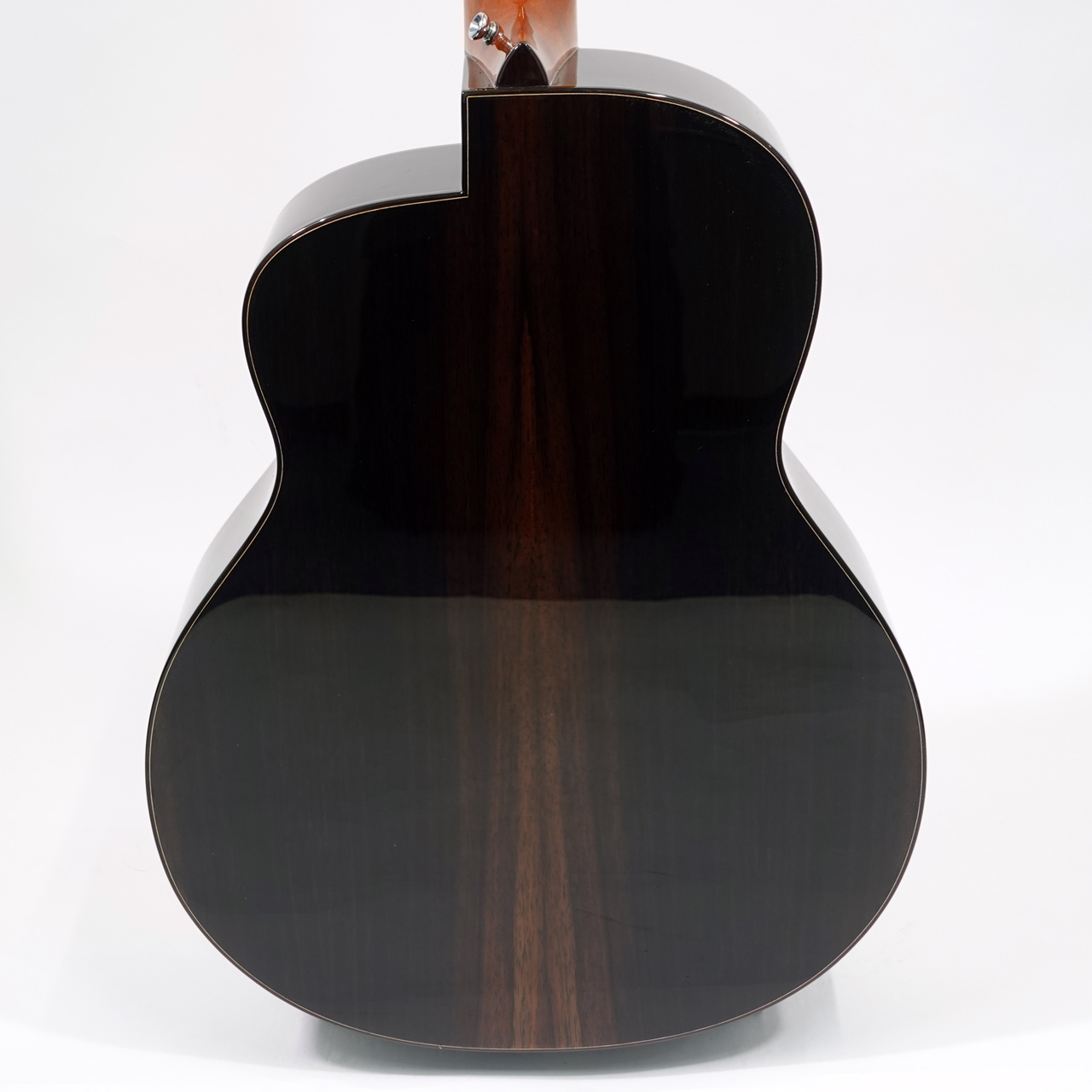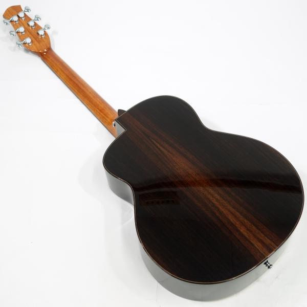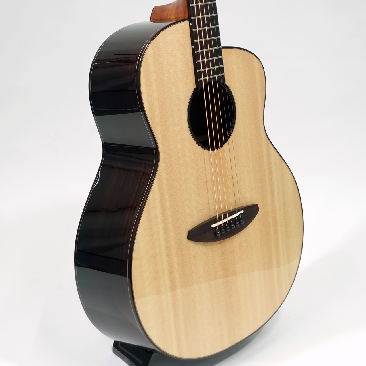 スペックはオーソドックスなスプルース単板トップ、ローズウッド材サイド&バック、マホガニー材ネック、ローズウッド材指板&駒、牛骨ナット&サドル、44mmナット幅、650mmスケール、グロス・ボディ&グロス・ネック、Air Blueピックアップ搭載となっております。ロゴなしのヘッドは杉田健司氏デザインのハンドカットヘッドストックを採用し、この価格帯とは思えないハイエンドギターのような高級感があります。