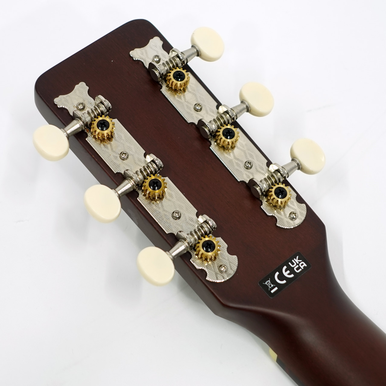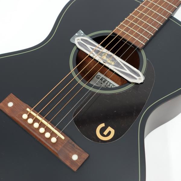Xブレーシングを施したボディには厳選された軽量ラミネート材を使用し、ウッディなヴィンテージトーンと耐久性を最適なバランスで実現しています。"C"シェイプのネックは、長年愛用してきた楽器のような優れた演奏性を提供します。Gretsch Deltoluxeマグネティックサウンドホールピックアップは、ライブパフォーマンスやレコーディングなどの現場で多用途なアコースティックトーンを生み出し、エフェクトペダルとの相性も抜群です。ヴィンテージスタイルのピンブリッジ、"G"グラフィック入りピックガード、ペイントされたピンストライプパーフリング、"3-on-a-plate"オープンギアチューニングマシン、オーバーサイズドットインレイなど、当時の仕様に忠実なディテールがノスタルジックな個性を醸し出します。