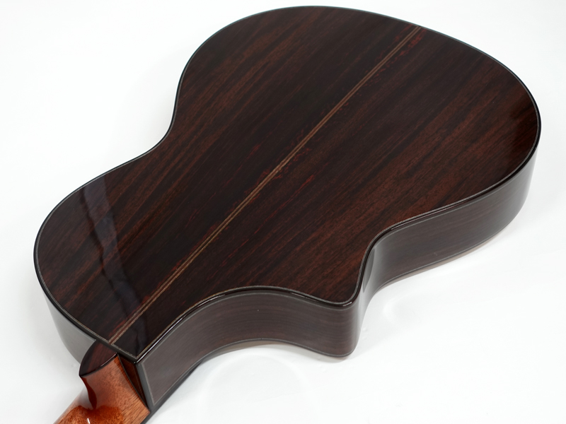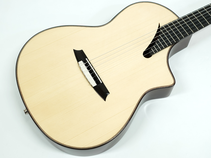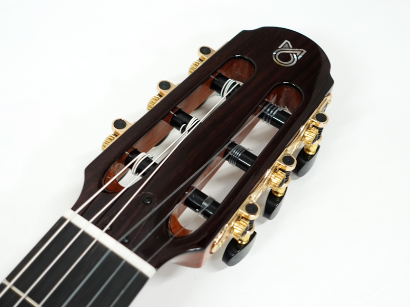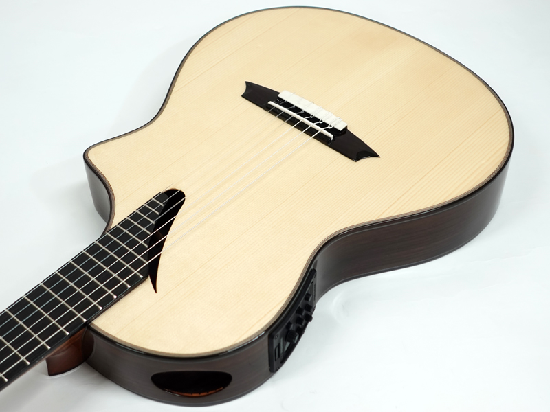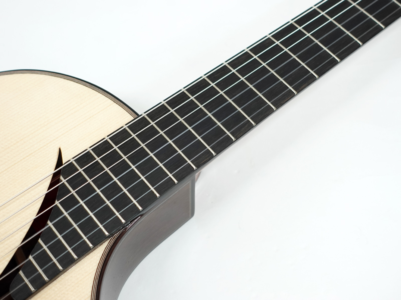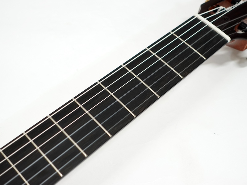 ナット幅は48mmと一般的なガットギターより少し細く、シェイプもかなり薄めのため、ガットギター特有の丸みを帯びたネックシェイプが苦手な方でも弾きやすく、持ち替えもスムーズです。