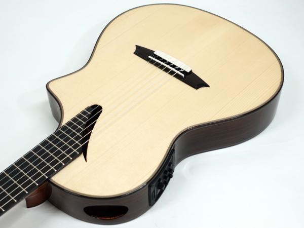 薄く取り回しに優れたボディで演奏性の高いモデルとなっておりますが、ルックスだけではなくサイドに設けられたサウンドホールやアンダーサドルタイプのピエゾピックアップ、扱いやすいプリアンプなど随所にプレイヤーの目線にたったこだわりが詰め込まれた一本となっています。