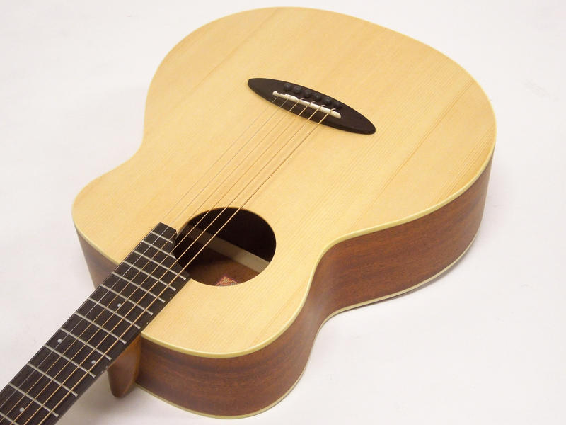 こちらはスプルース材トップ、マホガニー材サイド&バック、マホガニー材ネック、ローズウッド材指板&駒、牛骨ナット&サドル、43mmナット幅、610mmスケール、艶消しマットフィニッシュとお値段以上の作りの良さ、豊かな音色が特徴です。