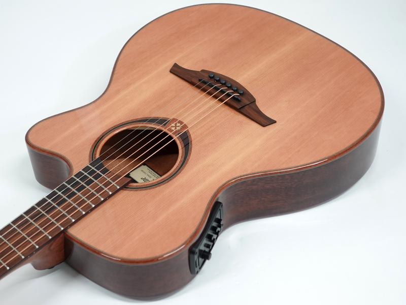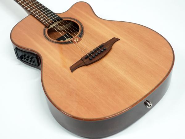 シダー単板トップ、薄胴タイプでライブでのフィット感は抜群です。