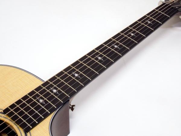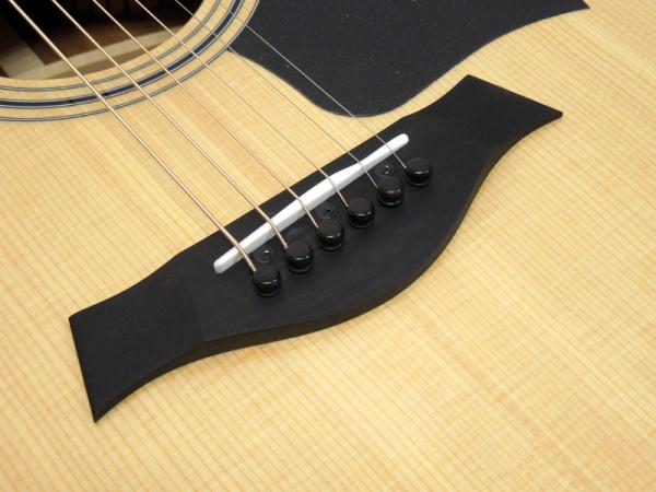 新たにデザインされたインレイやしっかり黒いエボニー指板で高級感が増しています。特に、トップ板が弦振動によってシーソーのように動くVブレーシングの採用は、以前までのXブレーシングとは全くの別物で、プレーン弦をはじめとする高音域が良く響き、一音一音が良く伸びてサスティーンの向上が確かに感じられます。ストロークでもしっかり音が前に飛び出していくように良く鳴り、バランスも良くジャンルを選ばずお使いいただける良質なサウンドです。
