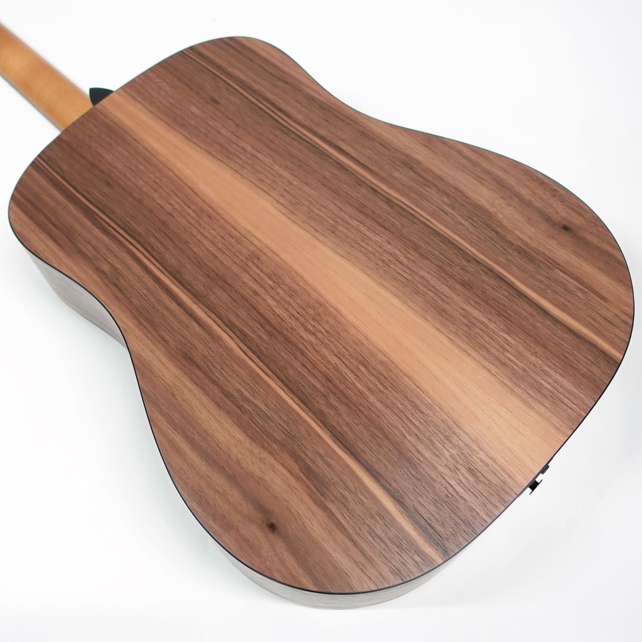 サウンドですが、ウォルナット材らしい明るく歯切れのある音色が特徴で、ピック弾きで気持ち良く前に飛んでいくサウンドが魅力的です。ストロークでもつぶれず、フィンガースタイルでも立ち上がりが良いので、様々な用途をカバーしてくれるでしょう。