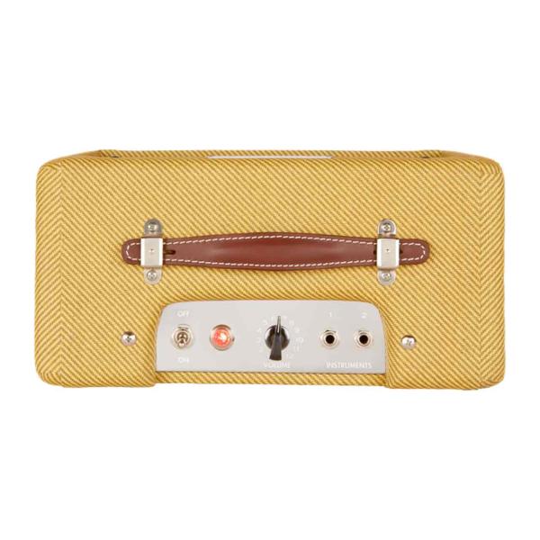 外装にはヴィンテージツイード加工、チキンヘッド・コントロールノブ、レザーハンドル、ロー/ハイ両出力インストゥルメント対応の