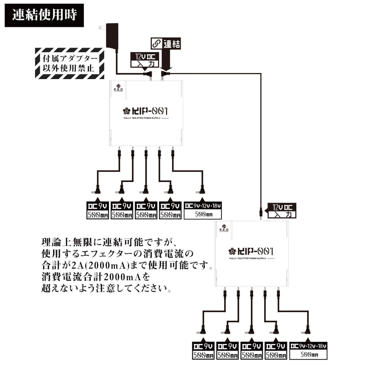 ※理論上無限に連結可能ですが、使用するエフェクターの消費電流の合計が2A(2000mA)まで使用可能です。消費電流合計2000mAを超えないよう注意してください。