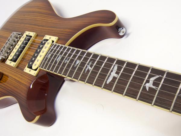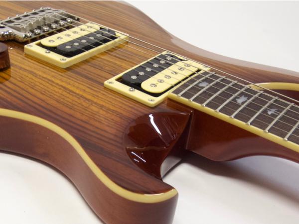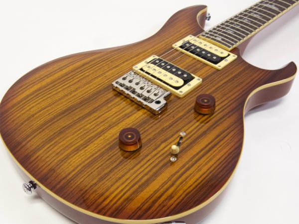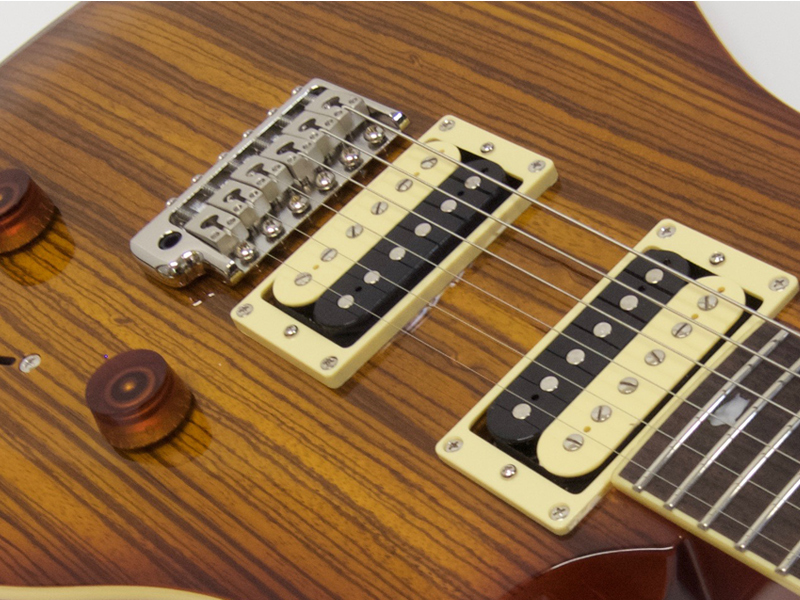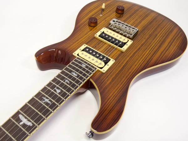 PRS SE Custom 24は初期PRSモデルのスペックを忠実に反映させたSEシリーズの典型的モデル。SE Custom 24にゼブラウッド・ベニアを配し、Vintage Sunburstフィニッシュで仕上げたSE Custom 24 Zebrawood。独特のルックスを放ちながらも、高いプレイアビリティ、信頼性、鮮やかなトーンはPRSそのもの。メイプル・トップ+マホガニー・バック、Wide Thinメイプル・ネック、24フレット、25インチ・スケール、特許取得PRS Moldedトレモロ、デュアル85/15 "S"ピックアップ+3-wayブレード・スイッチ、プッシュ/プル・トーン・ノブ(コイルタップ)のSE Custom 24のスペックをすべて搭載。ライブでもスタジオでも圧倒的に「使える」1本です。