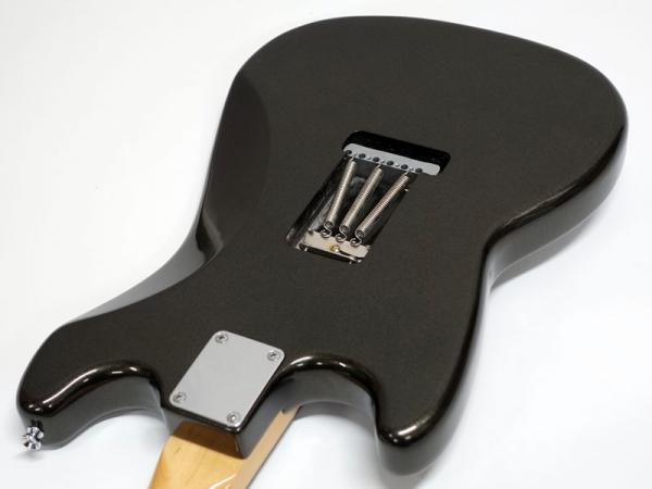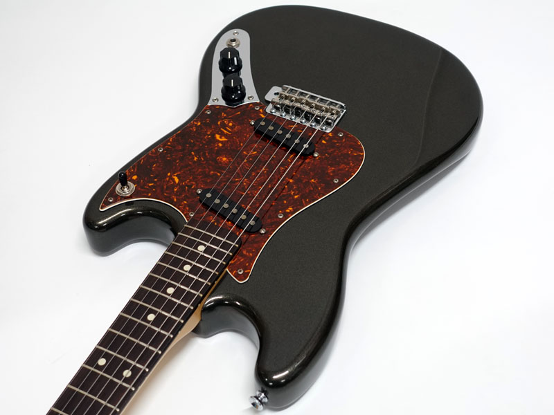 ラメ入りのブラックに赤べっ甲ピックガードを合わせ、マッチングヘッドにパープルロゴをいれたサイケデリズムらしいルックス。