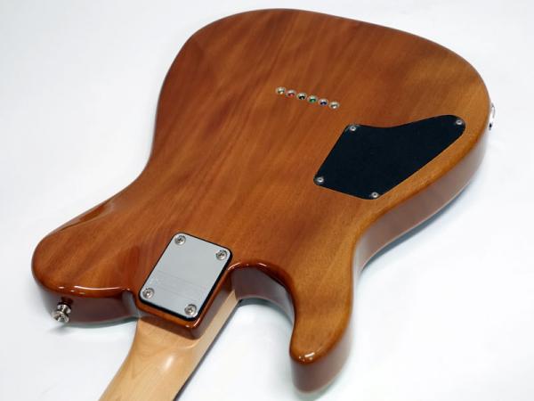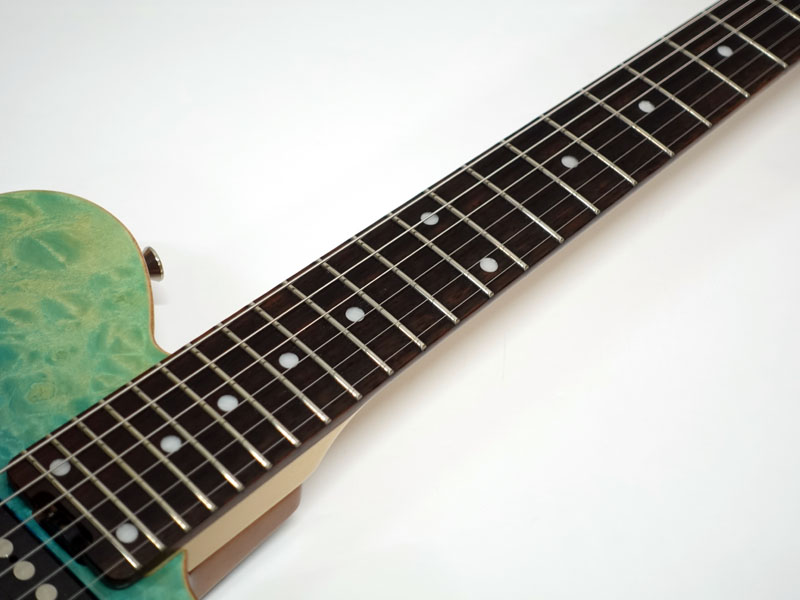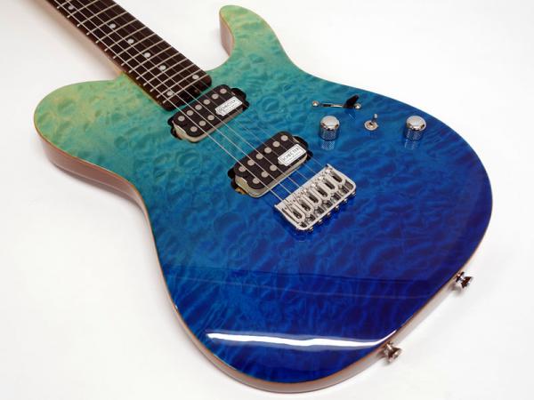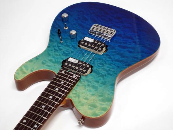 本機は限定モデルとして製作され、マホガニーボディに鮮やかなキルトメイプルトップを採用。ボディトップのフィニッシュは杢目を活かしたグラデーションのブルーフェイドカラーで特別感の高い一本です。Gotoh製ロックペグ、Hipshot製ブリッジ搭載。