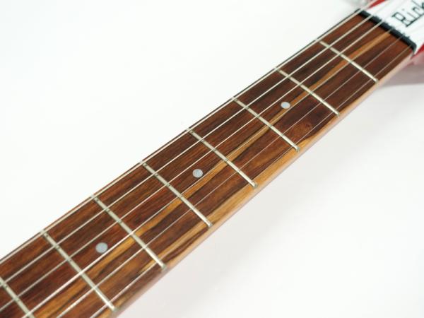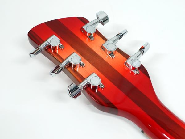 ちょっと変わったリッケンならではのコントロール。ブリッジに一番近いのがフロントトーン、時計回りにフロントボリューム、リアボリューム、小さめのつまみがフィフス・コントロール、そしてリアトーンと、2ボリューム、2トーンと言えばレスポールが代表的ですが、ほとんどが逆配置となっています。そして小さめのつまみフィフス・コントロール。こちらはフロント専用のボリュームバランサーと思って頂ければよいかと思います。ゼロにはなりませんがリアとフロントの音量バランスを取る機能でご使用下さい。(フルでフロント本来の音量が得られます。ゼロにしてもフロントの音量はゼロになりません。)