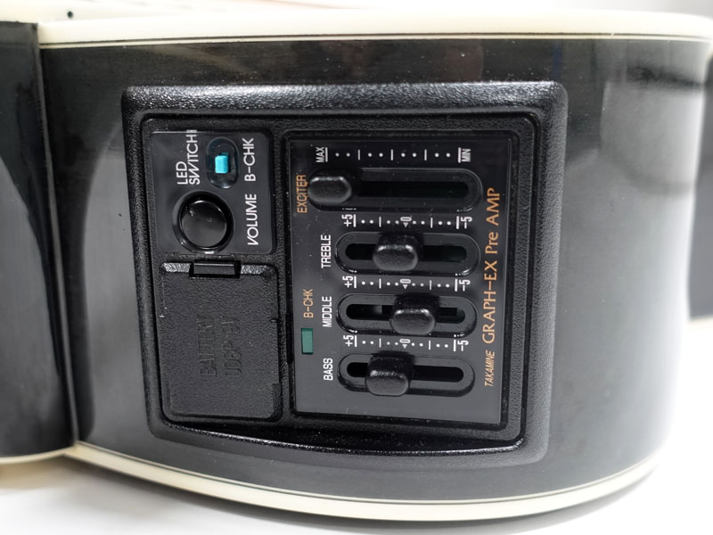 オリジナルプリアンプは3バンドイコライザで積極的なサウンドメイクが可能、ジャックを挿した状態ならバッテリーチェックもできるスグレモノです。