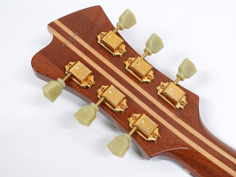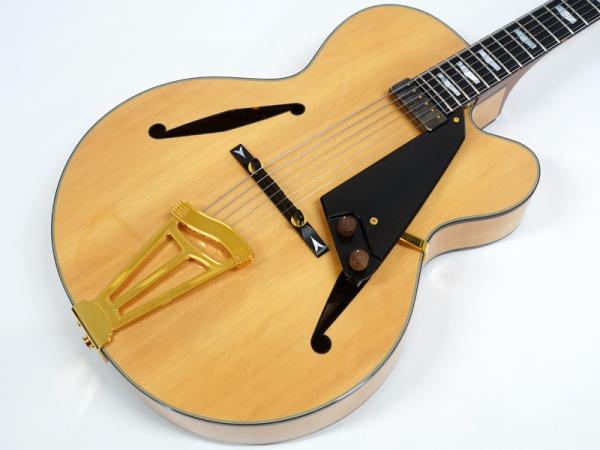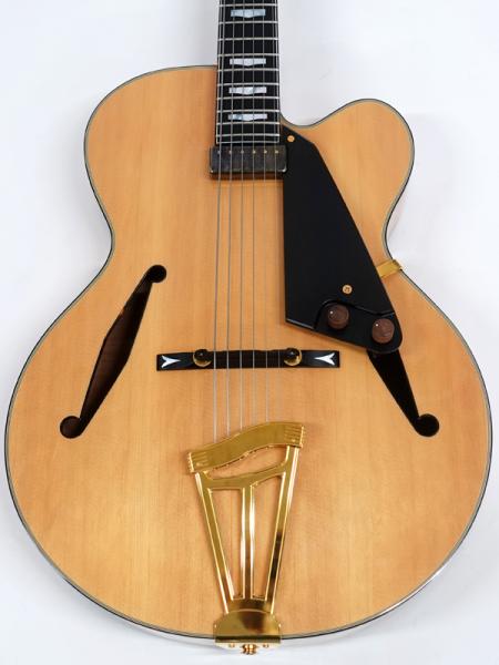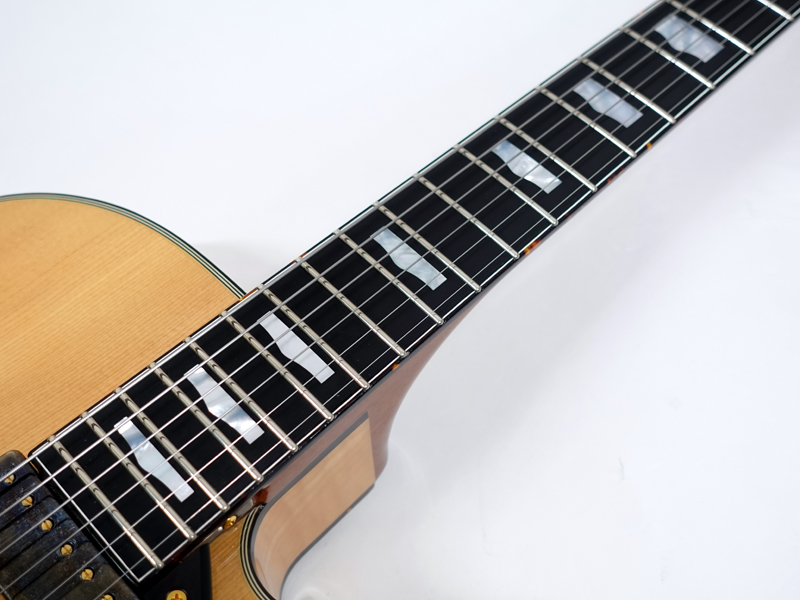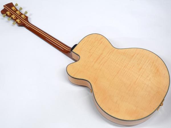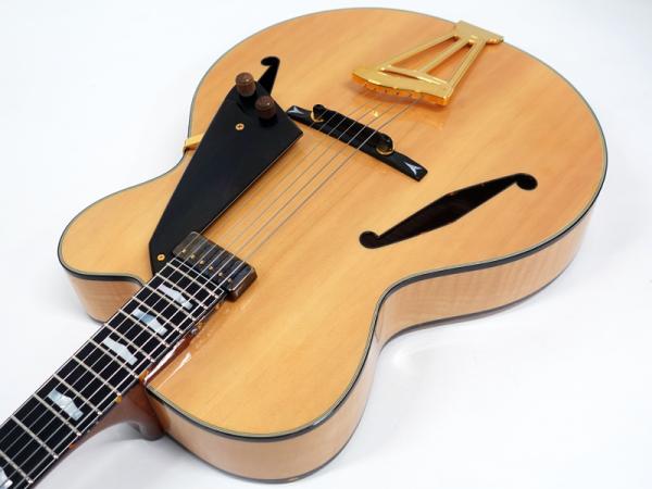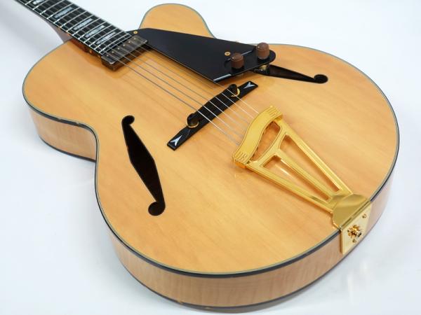 スプルーストップ・カーリーメイプルサイドバックボディ、エボニー指板、ジャズナチュラルカラーの組み合わせ。トップ材の響きを最大限に活かすため、ほとんどのハードウェアパーツがボディに穴を開けないでいい仕様のものです。ピックアップもフローティングタイプのものを採用しています。