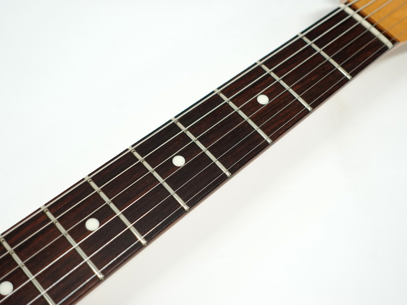 このスタイルとしては軽量で取り回しが良く、アッシュボディらしい粒立ちの良さの感じられます。アッシュの導管が浮き出るほど薄く仕上げられたウレタン塗装で鳴りも軽快です。