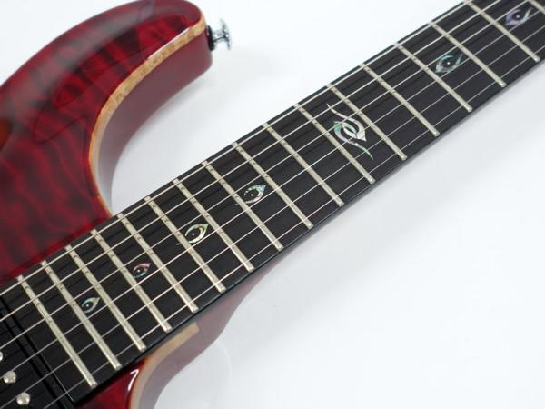アーチトップのダブルカッタウェイスタイル。キルトメイプルトップ、マホガニーボディ、マホガニーネックにエボニー指板。シースルーのレッドに化粧板ではない極厚のキルトメイプルの杢目が非常に高級感があります。