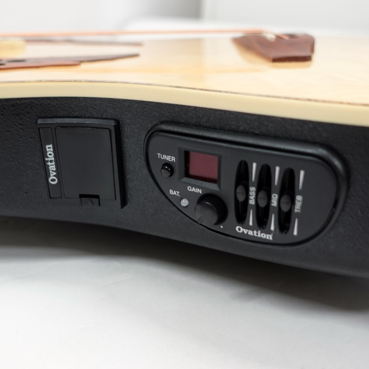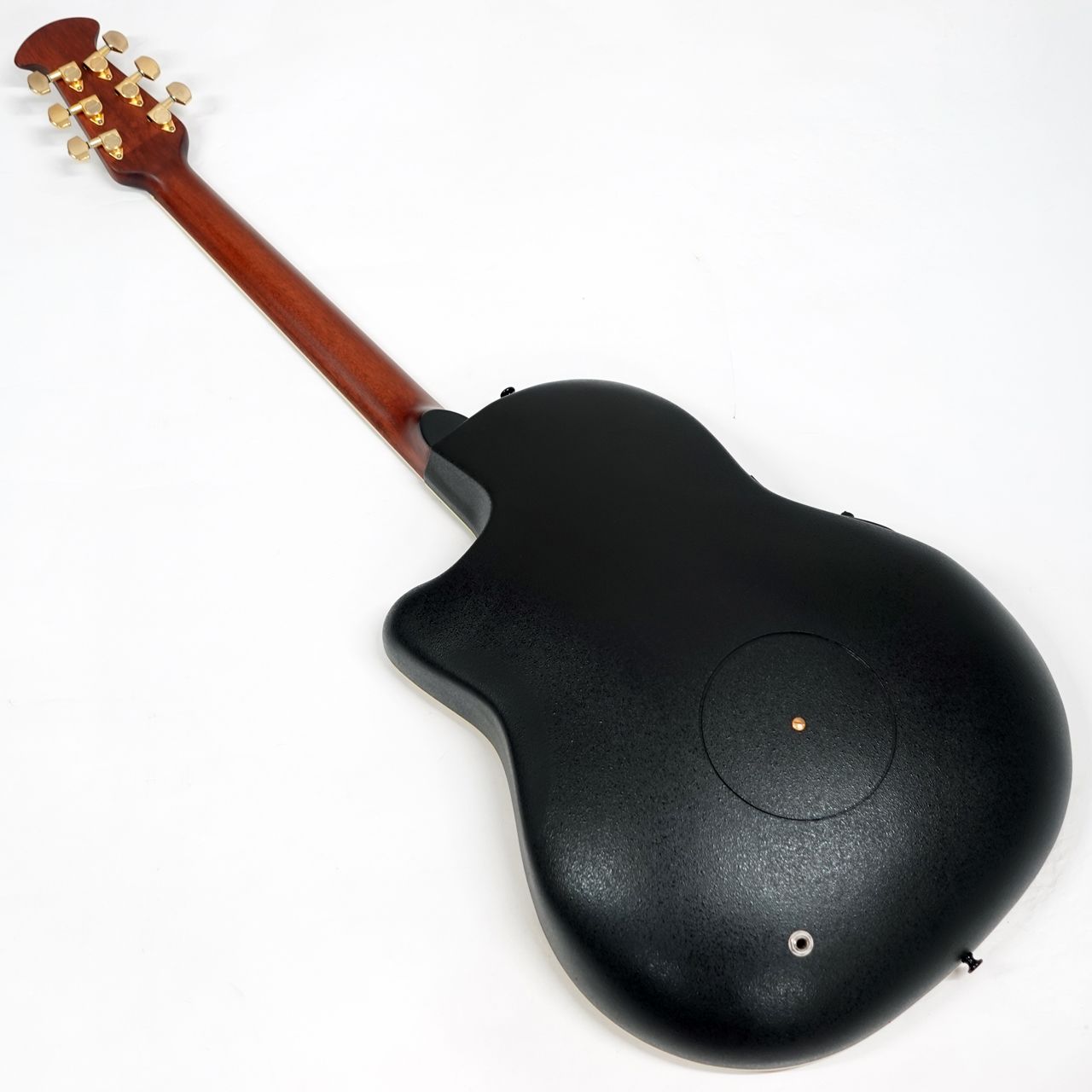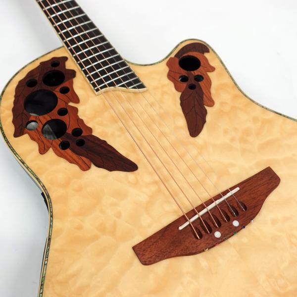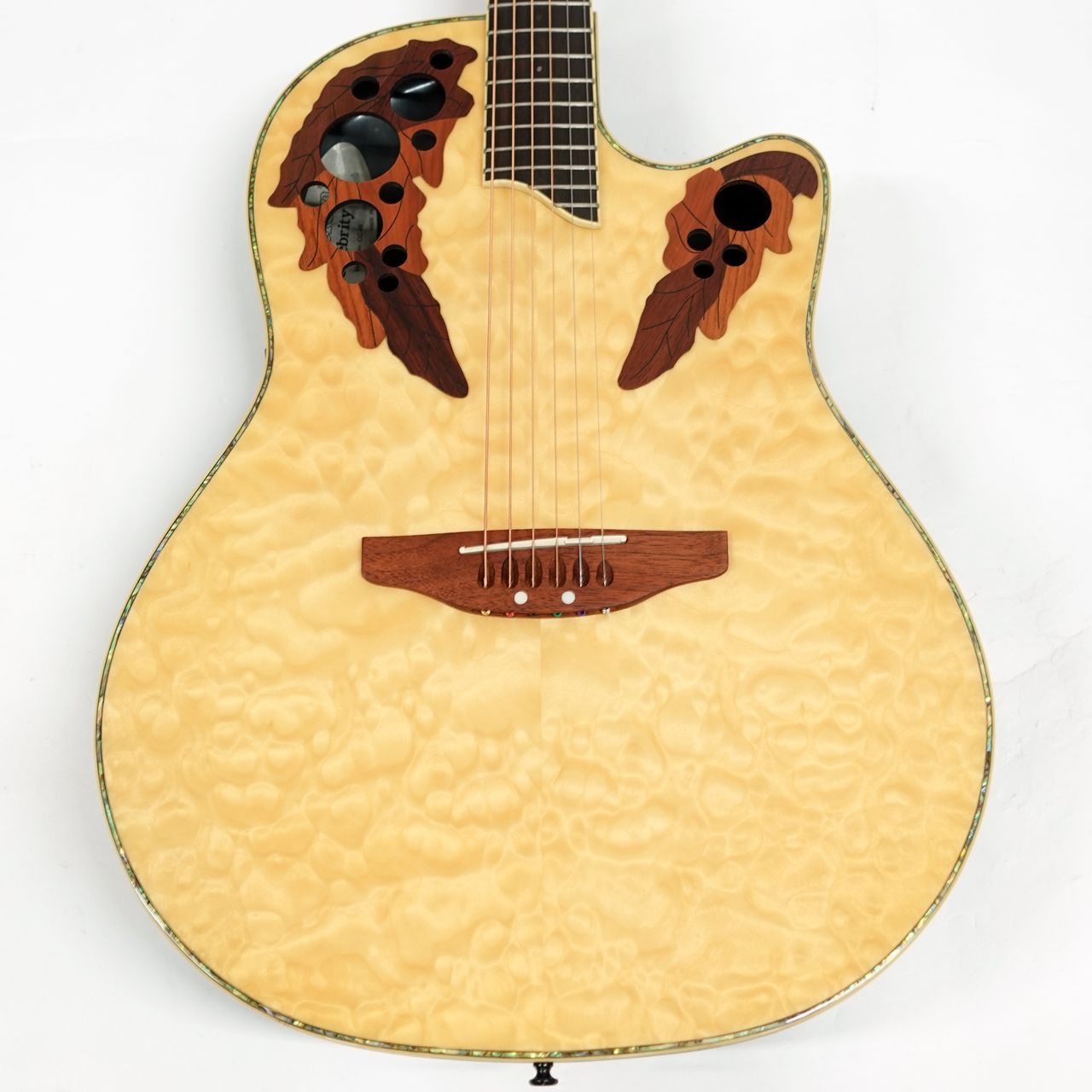 そしてオリジナルのピエゾ・ピックアップ、定評のあるオベーションエレクトロニクスを搭載。今ではよくあるシングルカッタウェイのボディシェイプですが元祖ならではの洗練されたルックス、これぞオベーションなマルチサウンドホール。