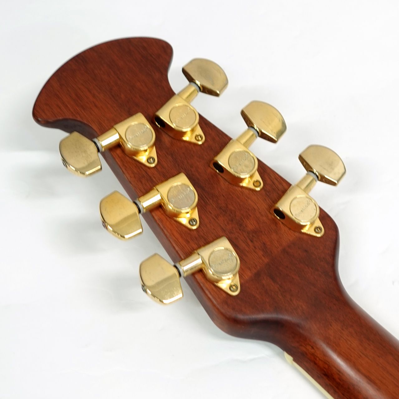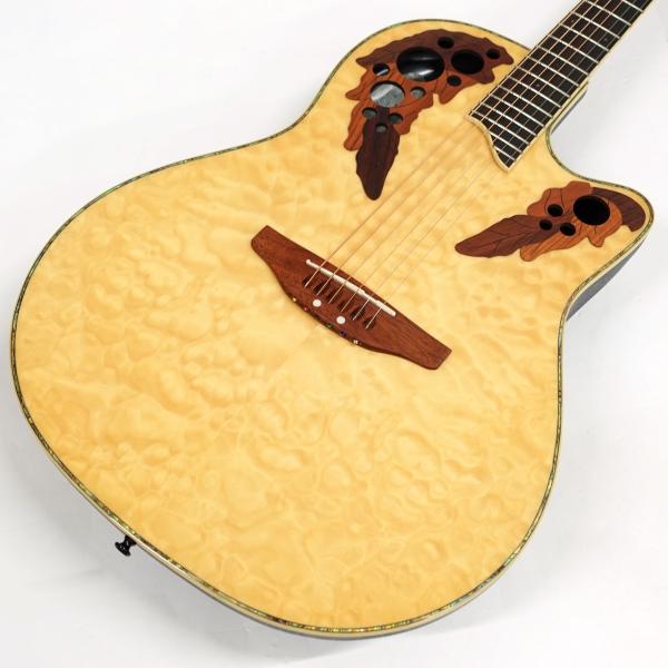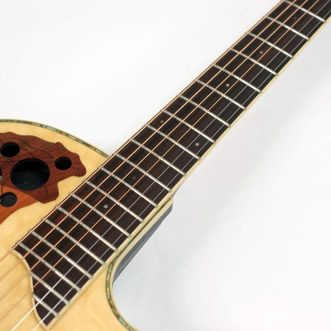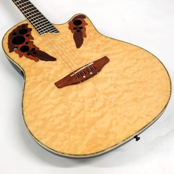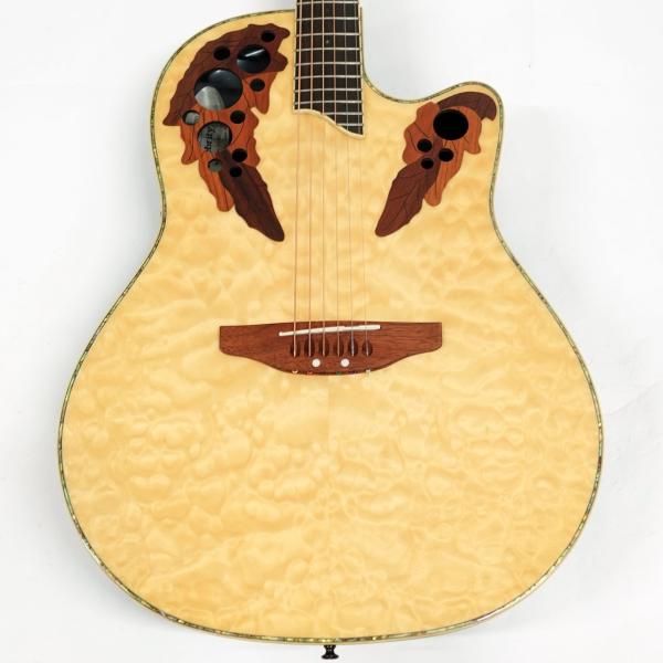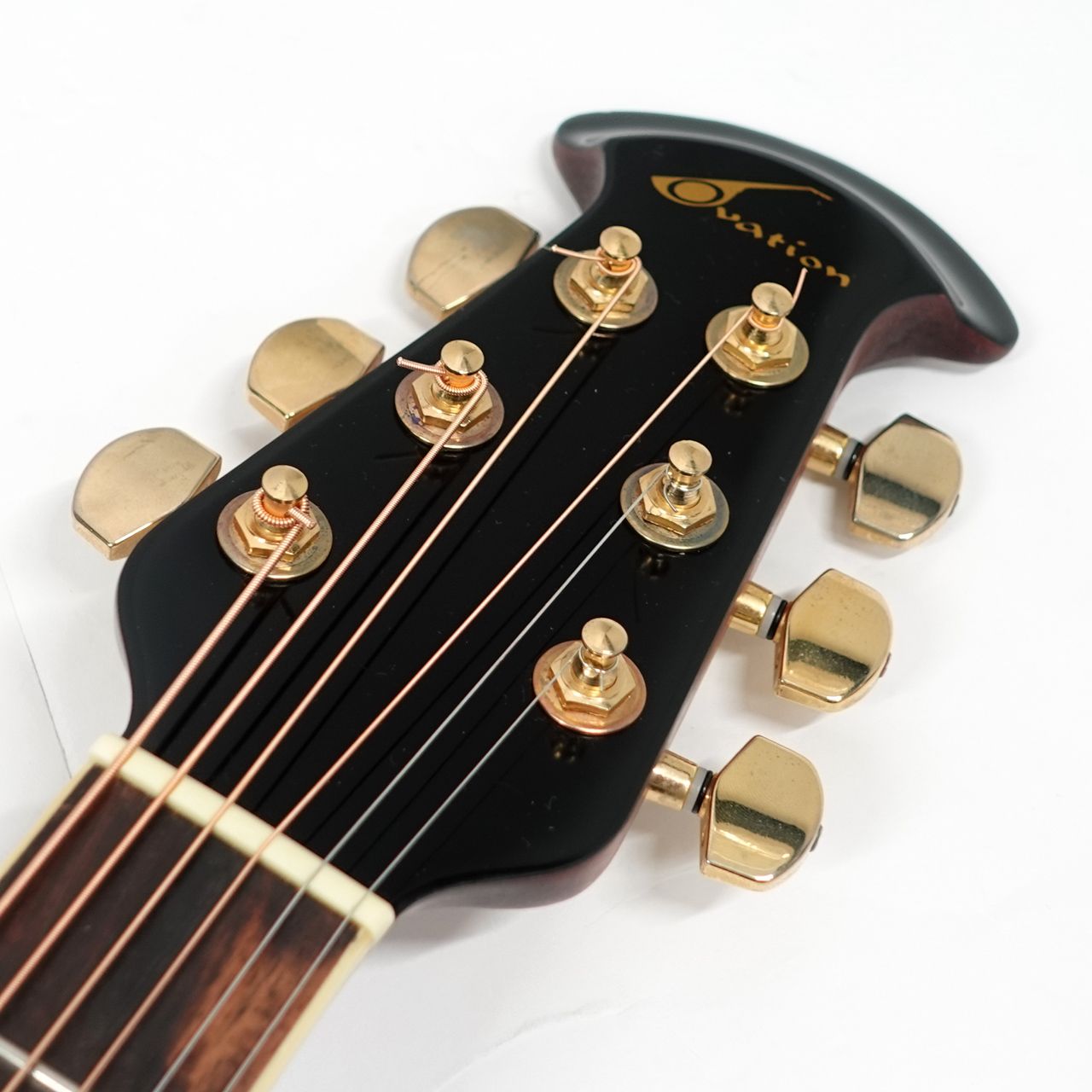 そしてオリジナルのピエゾ・ピックアップ、定評のあるオベーションエレクトロニクスを搭載。今ではよくあるシングルカッタウェイのボディシェイプですが元祖ならではの洗練されたルックス、これぞオベーションなマルチサウンドホール。
