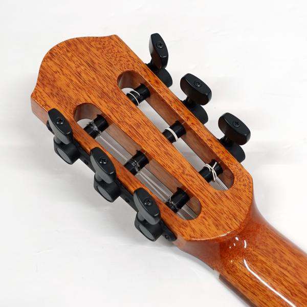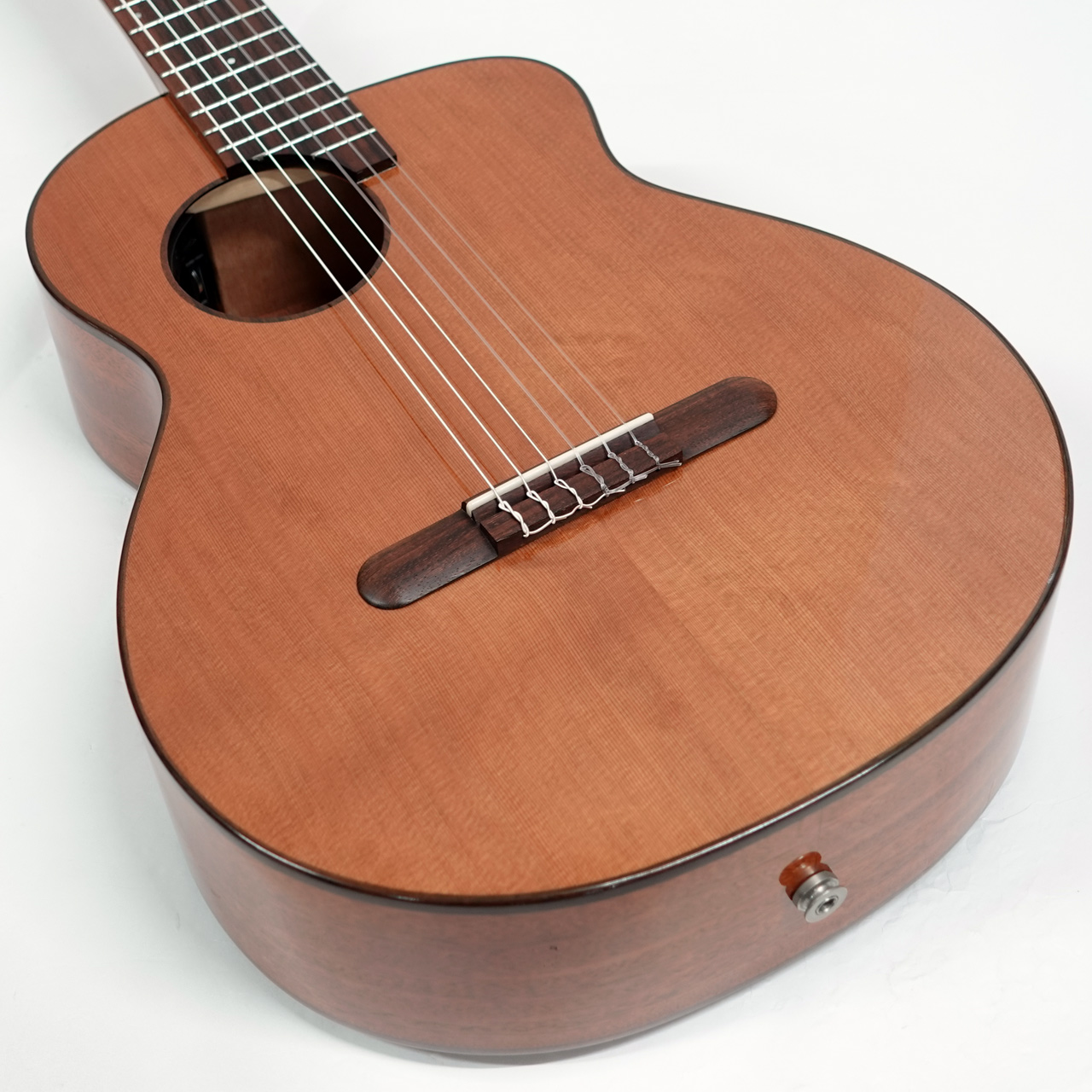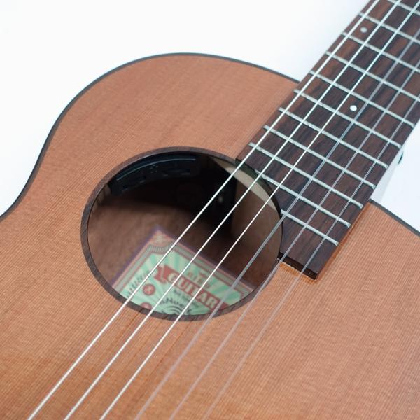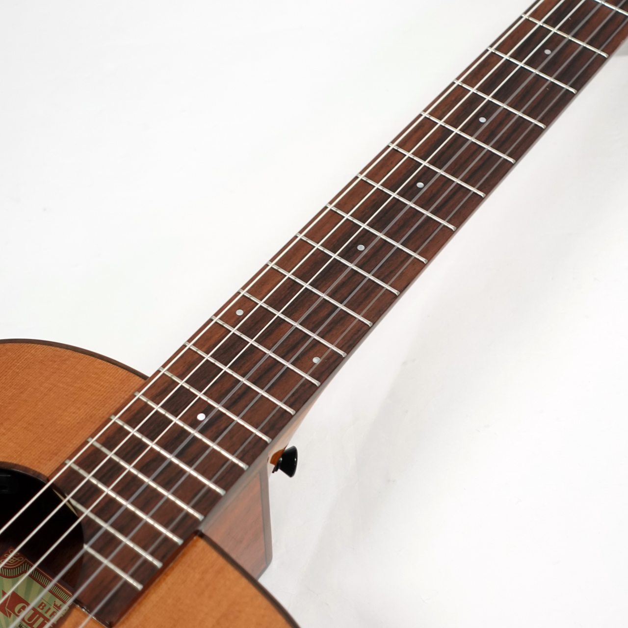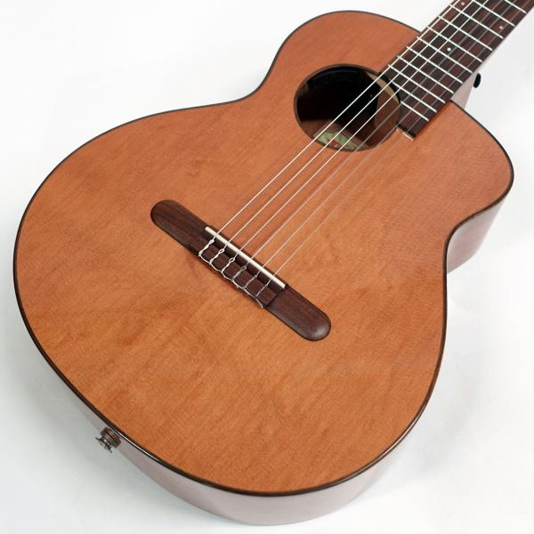 こちらは大人気となっているミニガットのモデルで、シダー材単板トップ、マホガニー材サイド&バック、マホガニー材ネック、ローズウッド材指板&駒、牛骨ナット&サドル、48mmナット幅、610mmスケール、ローズウッド材バインディング&グロスフィニッシュとお値段以上の上質な見た目、豊かな音色が特徴です。