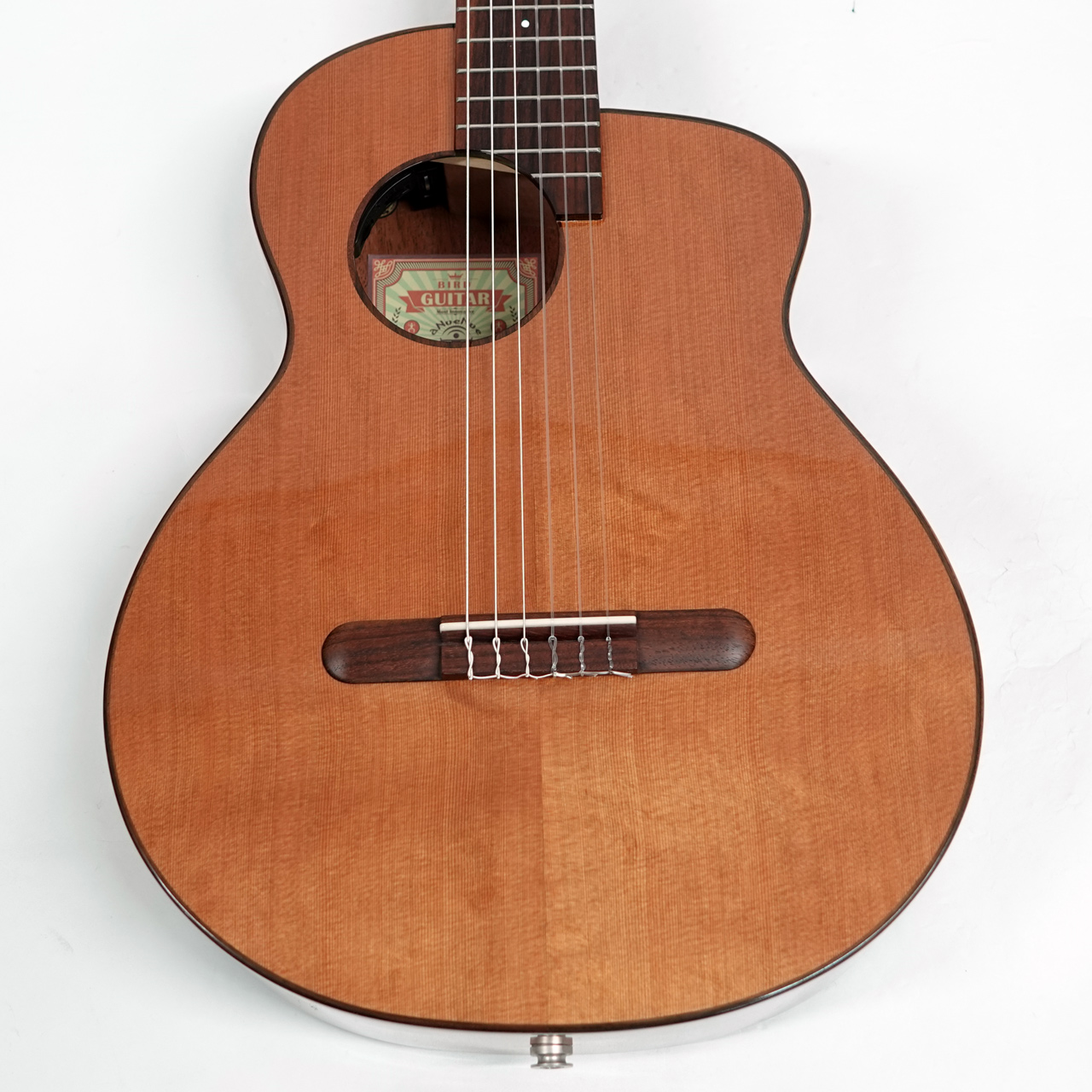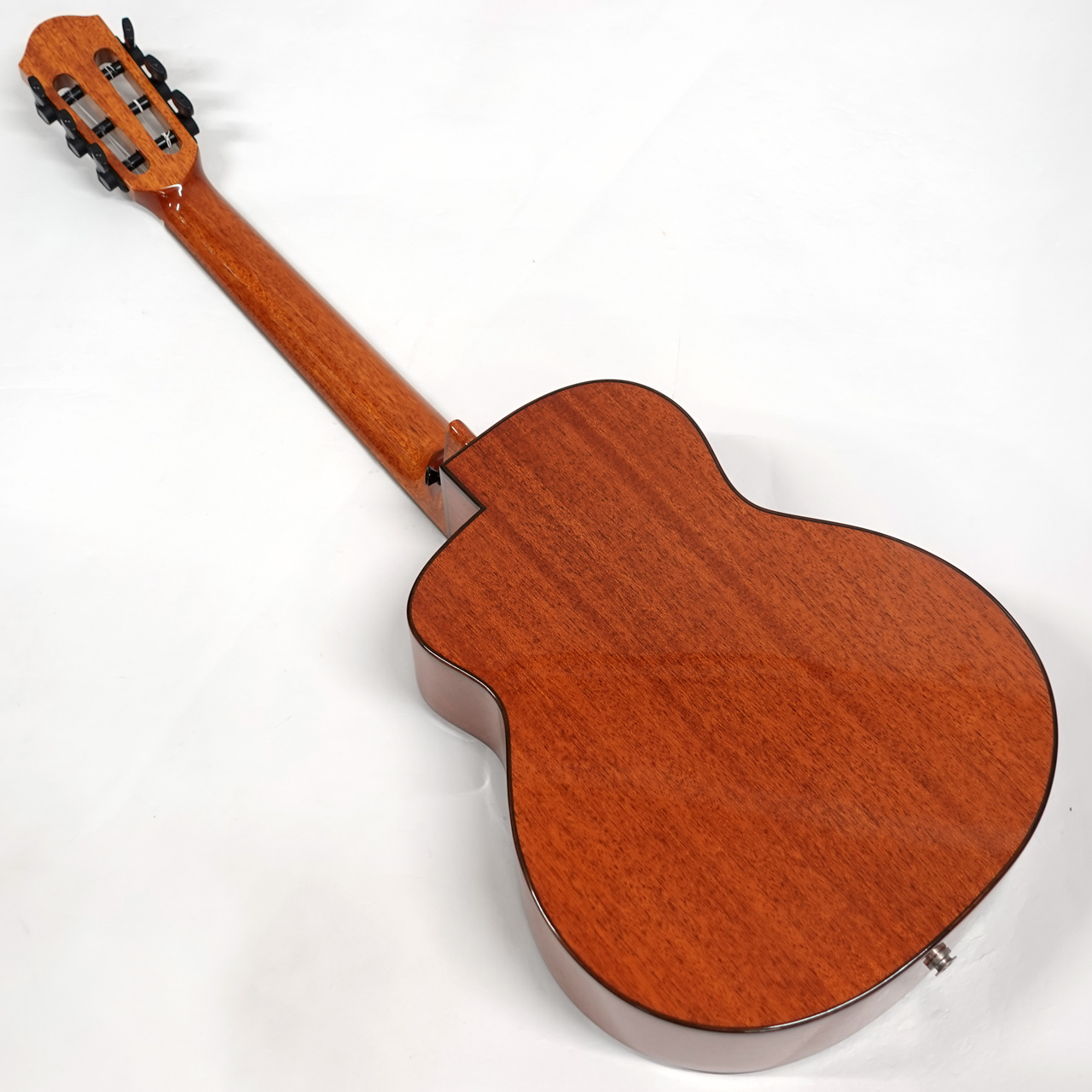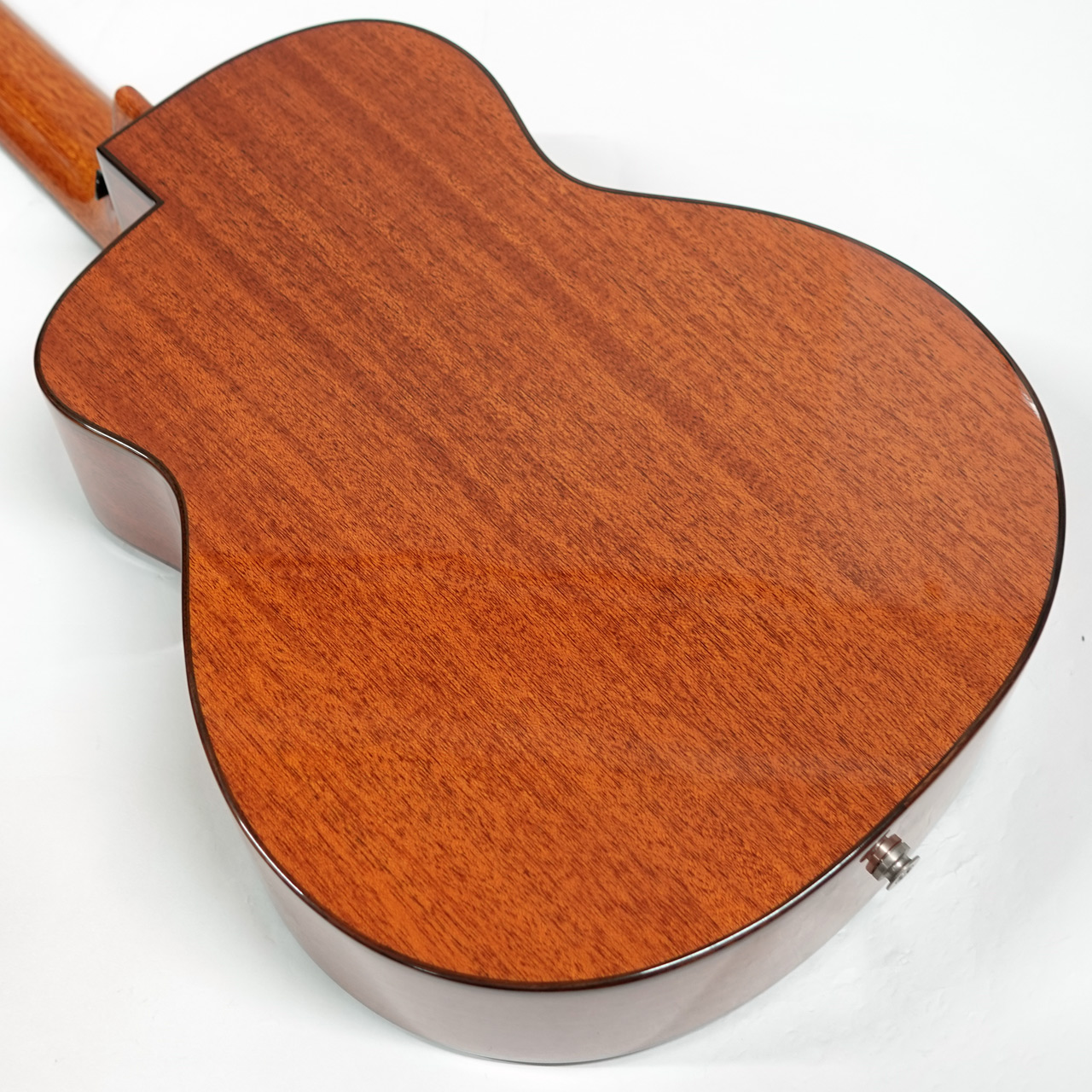 こちらは大人気となっているミニガットのモデルで、シダー材単板トップ、マホガニー材サイド&バック、マホガニー材ネック、ローズウッド材指板&駒、牛骨ナット&サドル、48mmナット幅、610mmスケール、ローズウッド材バインディング&グロスフィニッシュとお値段以上の上質な見た目、豊かな音色が特徴です。