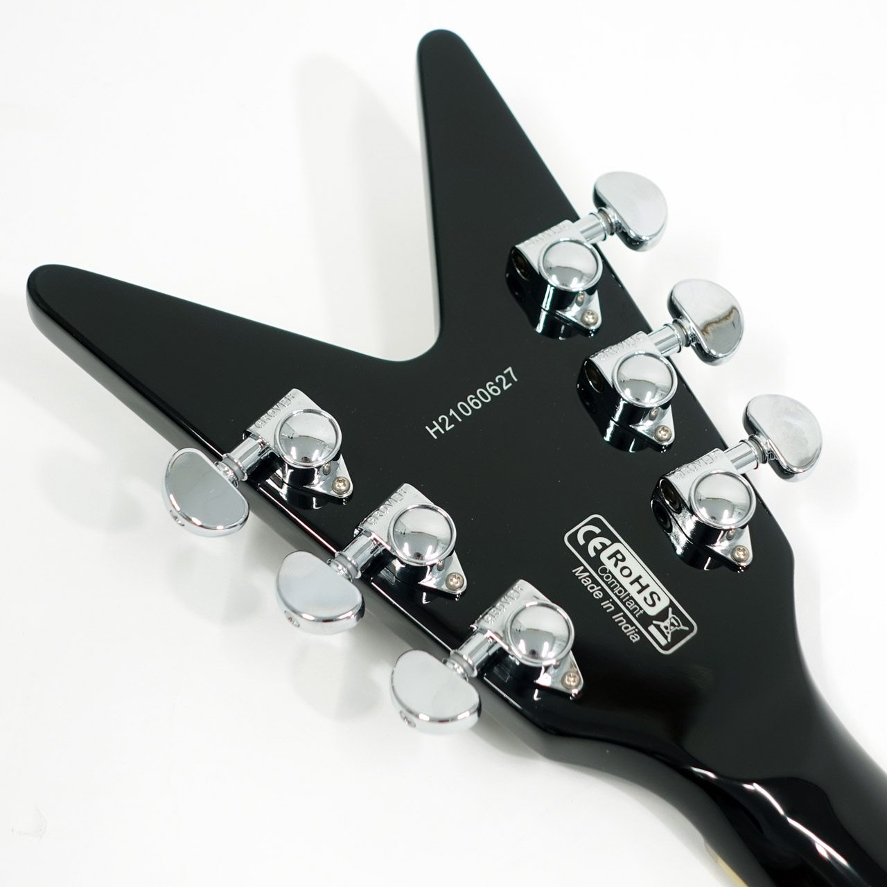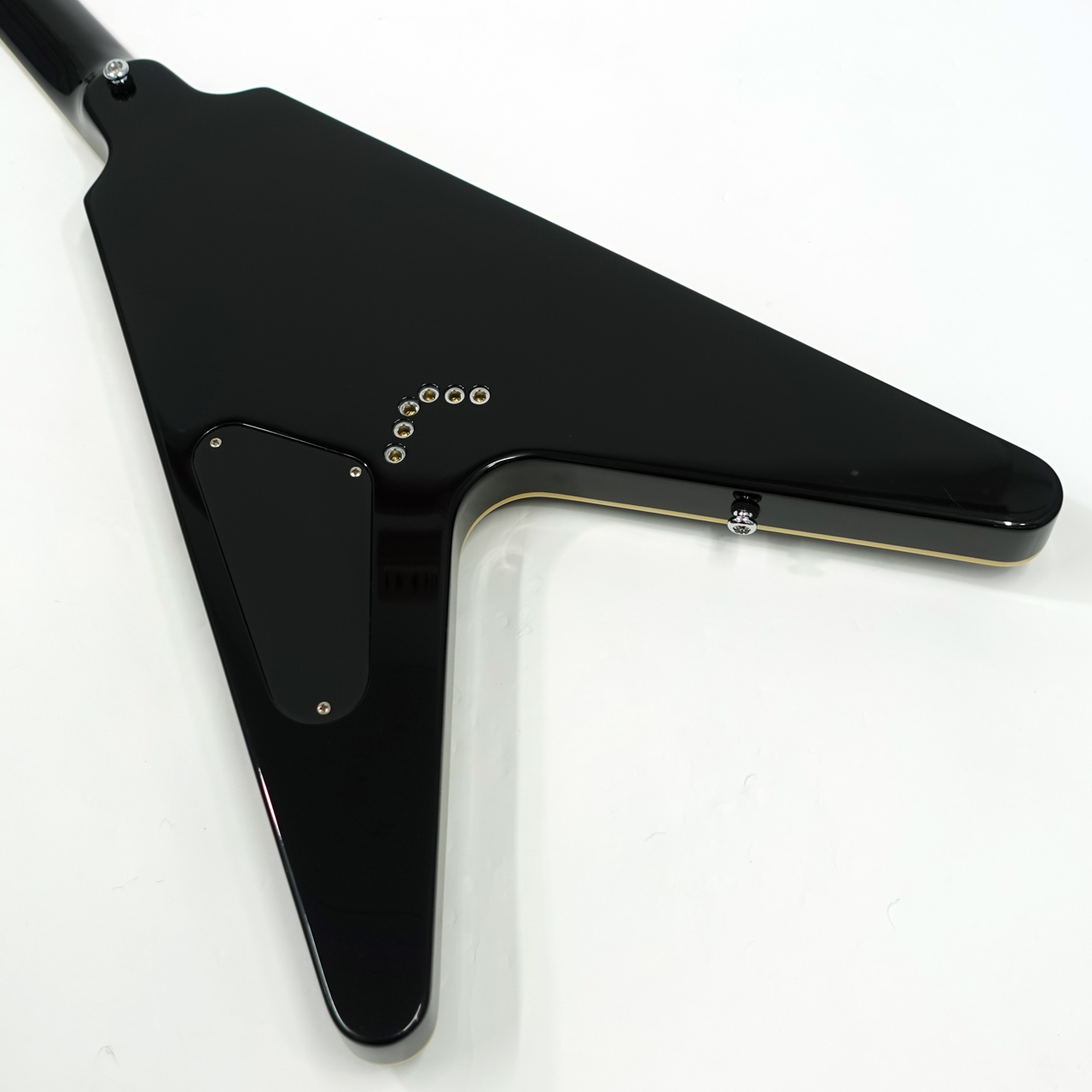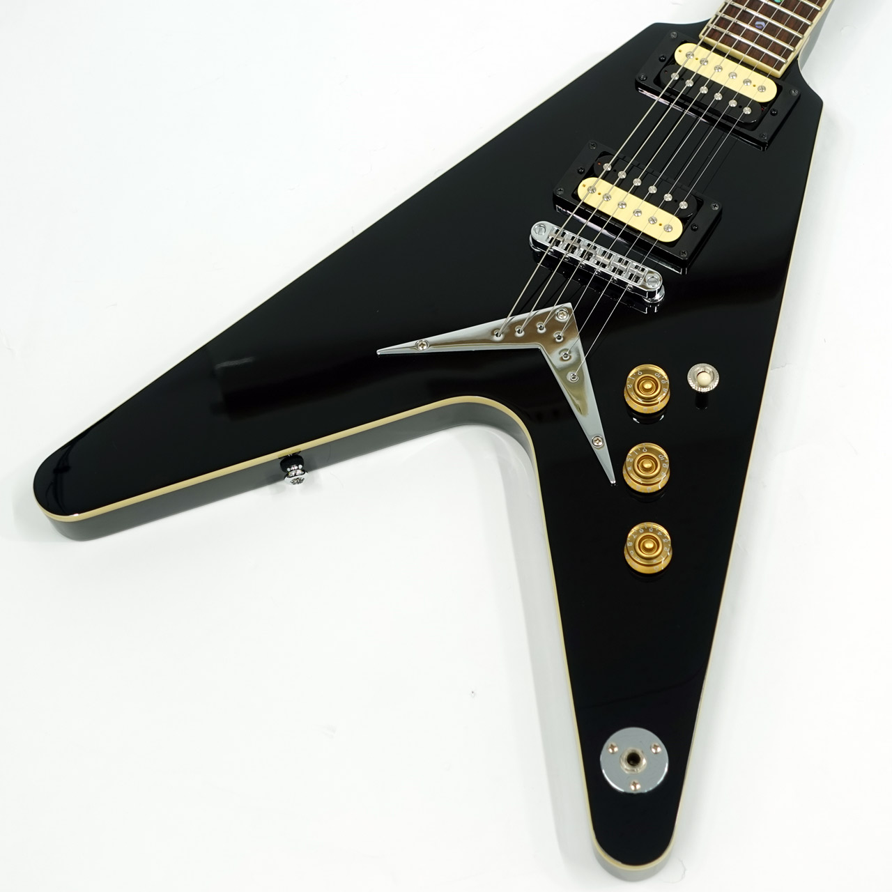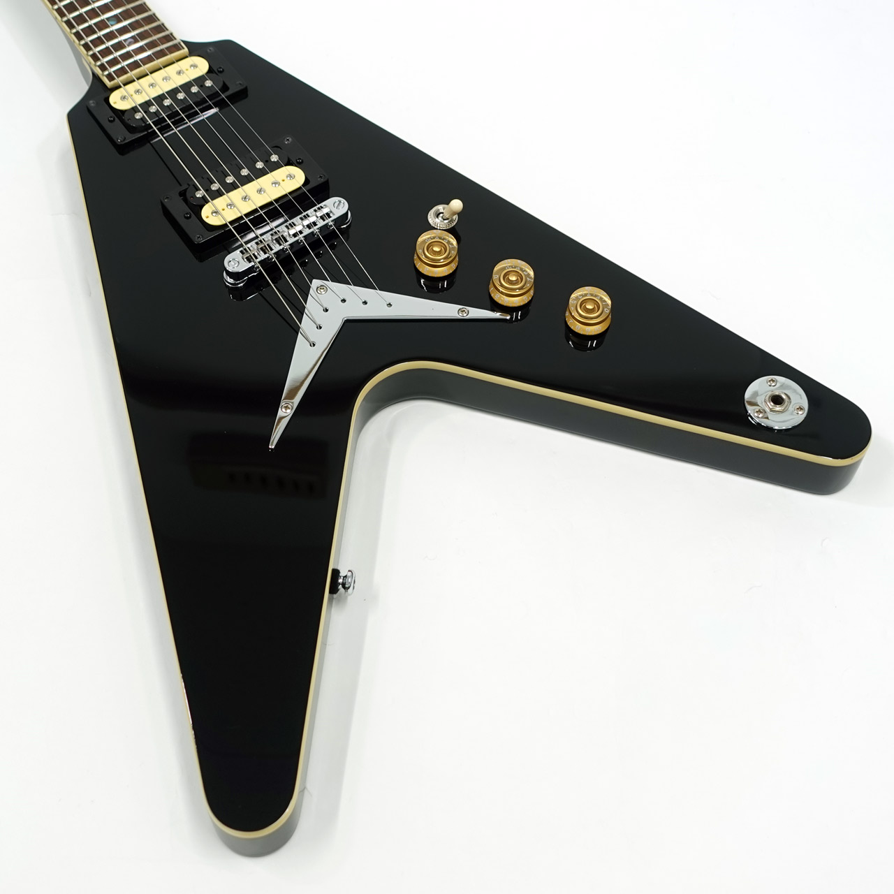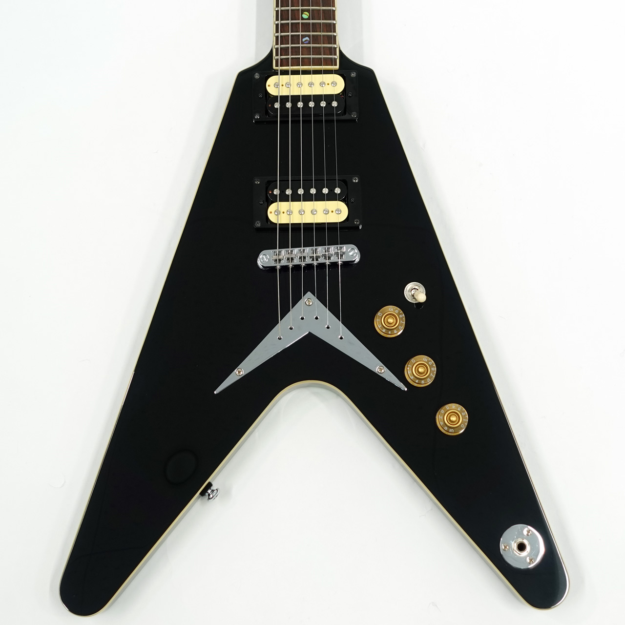 マホガニーボディ、マホガニーVシェイプネック、ローズウッド指板のジャンボフレット、ミディアムスケール、セットネックジョイント、グローバーチューナーと定番フライングVのスペックを持ちます。