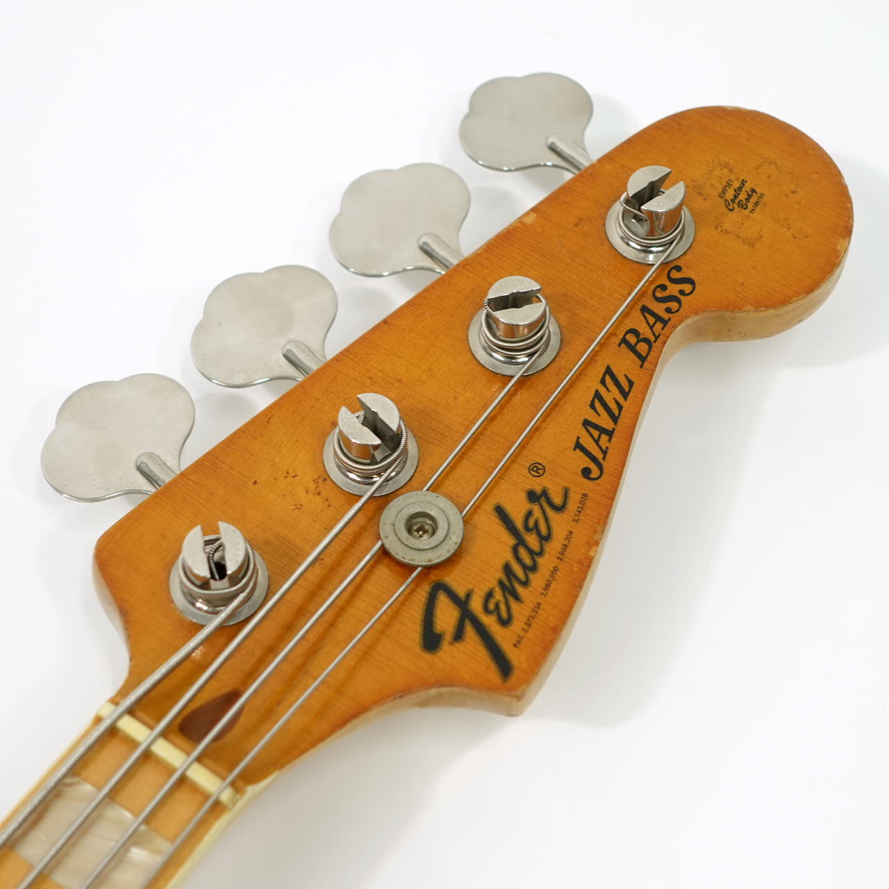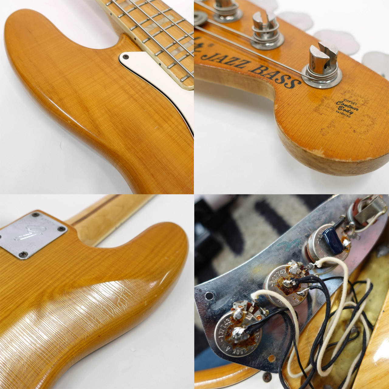 本器はネックデイト、ボディデイトは確認できませんがポットデイト(1377438)から1974年製と推定されるヴィンテージ・ジャズベース。