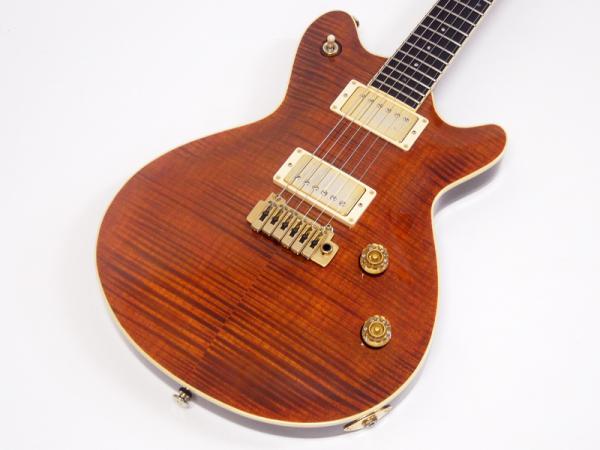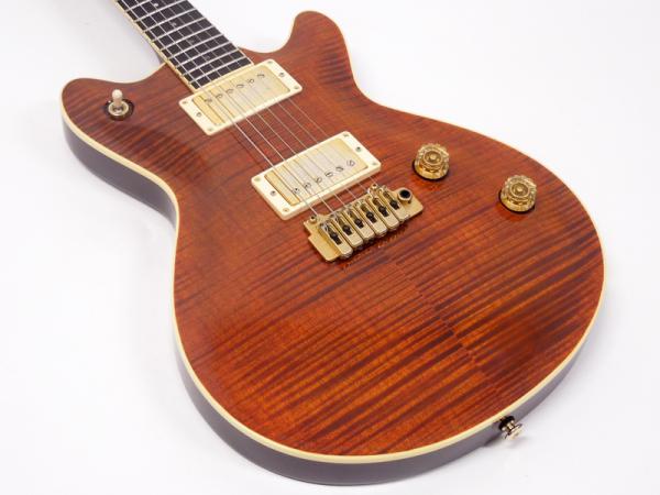 メイプルトップ/マホガニーバックのセットネック構造にダブルカッタウェイ仕様、チェンバー加工により豊かな鳴りと余韻を作り出し、ボディの軽量化にも貢献しています。