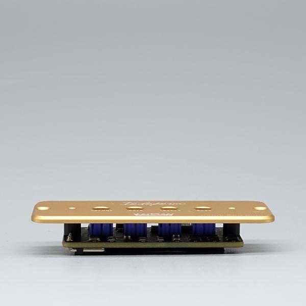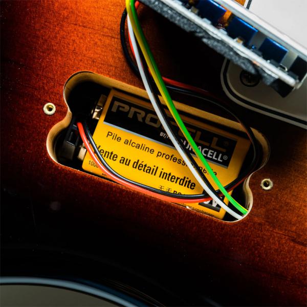 またヨードホルムのもう一つの大きな特徴は、この筐体の小ささと電池を内蔵する仕組みです。小さな筐体のおかげで、9V電池いわゆる006Pタイプの電池(約50×26 mm)をヨードホルムの取り付け加工のみで、電池も同時に収納することが可能です。大切なギターをできるだけ弄らない、またリペアを行う職人目線としては加工の手間を省くといったことが可能です。