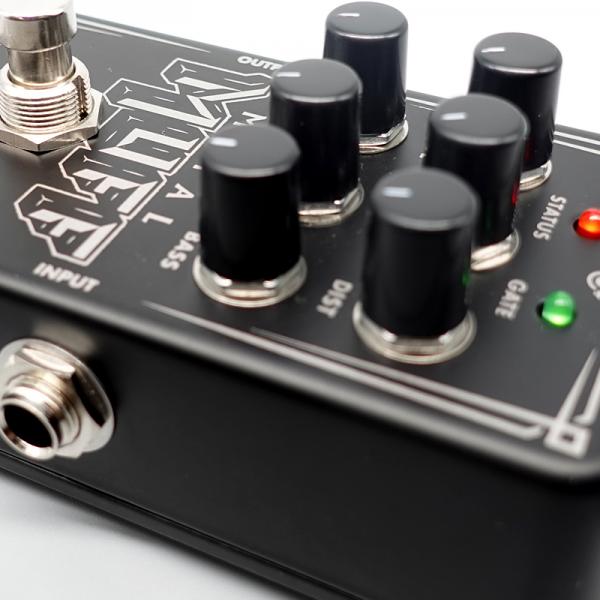 Nano Metal Muff の新たにデザインされたノイズゲートは優れた追加機能で、演奏を停止したときの不要なハムノイズを除去します。ノイズフロア・スレッショルド・コントロール(GATE)と、ゲートが作動したことを示す LED を備えています。さらに、コンパクトなサイズと多彩で直感的なコントロールも Nano Metal Muff を完成させる重要な要素です。