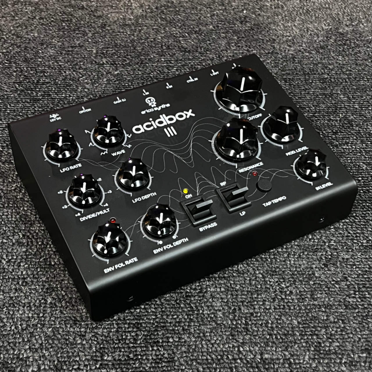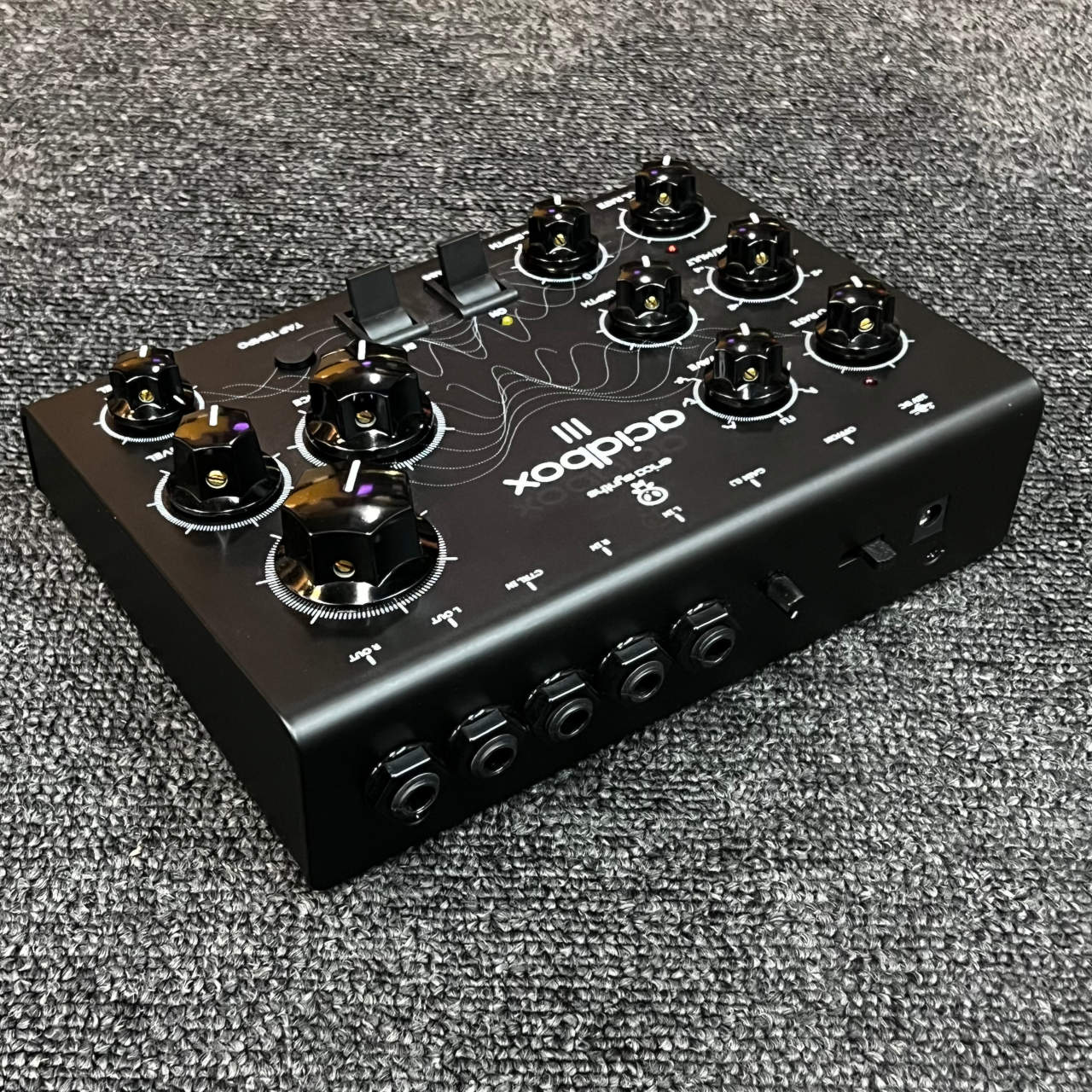 Acidbox IIIには調節可能な入力ゲインが備わっているため、ギターのように小さい音量のものからシンセサイザーやグルーヴボックスといったラインレベルの製品、モジュラーシンセなど様々な音源を柔軟に接続することができます。