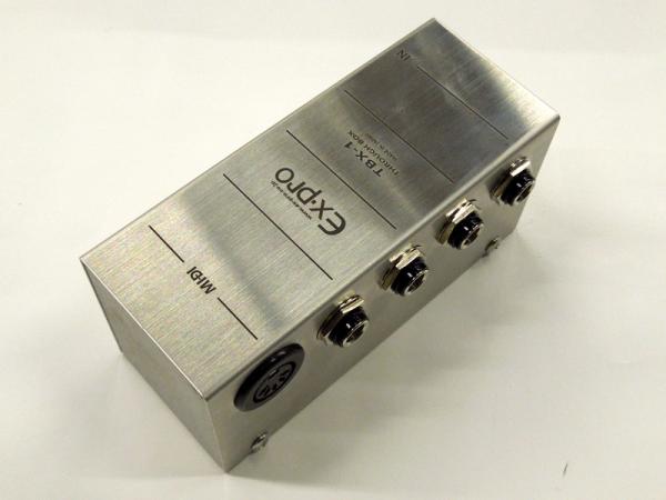 エフェクター・ボードに不可欠なスルー・ボックス(ジャンクション・ボックス)。エフェクター・ボード内のINPUTとOUTPUTの場所を一つのボック スにまとめることでよりセッティングがスムーズになります。エフェクターのINPUTジャックやOUTPUTジャック、スイッチングシステムのINPUT ジャックやOUTPUTジャックは、頻繁な抜き挿しによる故障も少なくありません。そしてエフェクターボード内の最初のエフェクターのINPUTと最後の エフェクターのOUTPUTの位置が抜き差しに不便な場所にきてしまう、そういった場合にもスルー・ボックス(ジャンクション・ボックス)が必要になりま す。スルー・ボックス(ジャンクション・ボックス)内は配線材や基板などを経由してジャックとジャックが繋がっているのが普通ですが、「TBX-1」は ジャックとジャックを直接半田付けしている為、配線材や基板などで起こり得る”ロス”を極限まで抑えることができました。右側面手前に「IN」のジャック を装備しています。このジャックに挿したプラグが演奏中に抜けてもすぐに+側がGRANDに落ちるようになっているため、アンプから大きいノイズが出てス ピーカーを痛める心配がありません。シャーシは頑丈なステンレスシャーシをオリジナルで製作。フォン・ジャック、MIDIジャックすべてシャーシアースを 取らずに装着していますので、MIDIのGRANDと音声信号のGRANDがTBX-1のシャーシで共通になることもなく、ノイズの心配もなくなります。 左側面と右側面のジャックの位置(高さ)を変えて配置することによりケーブルのセッティングを容易にしました。4系統ありますのでIN、OUT以外にも AMPのSEND/RETURNなどに繋ぐことができます。
