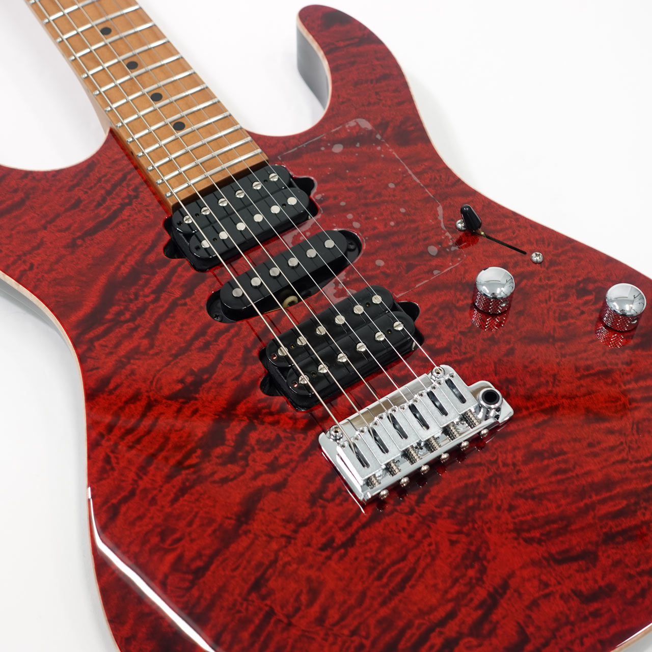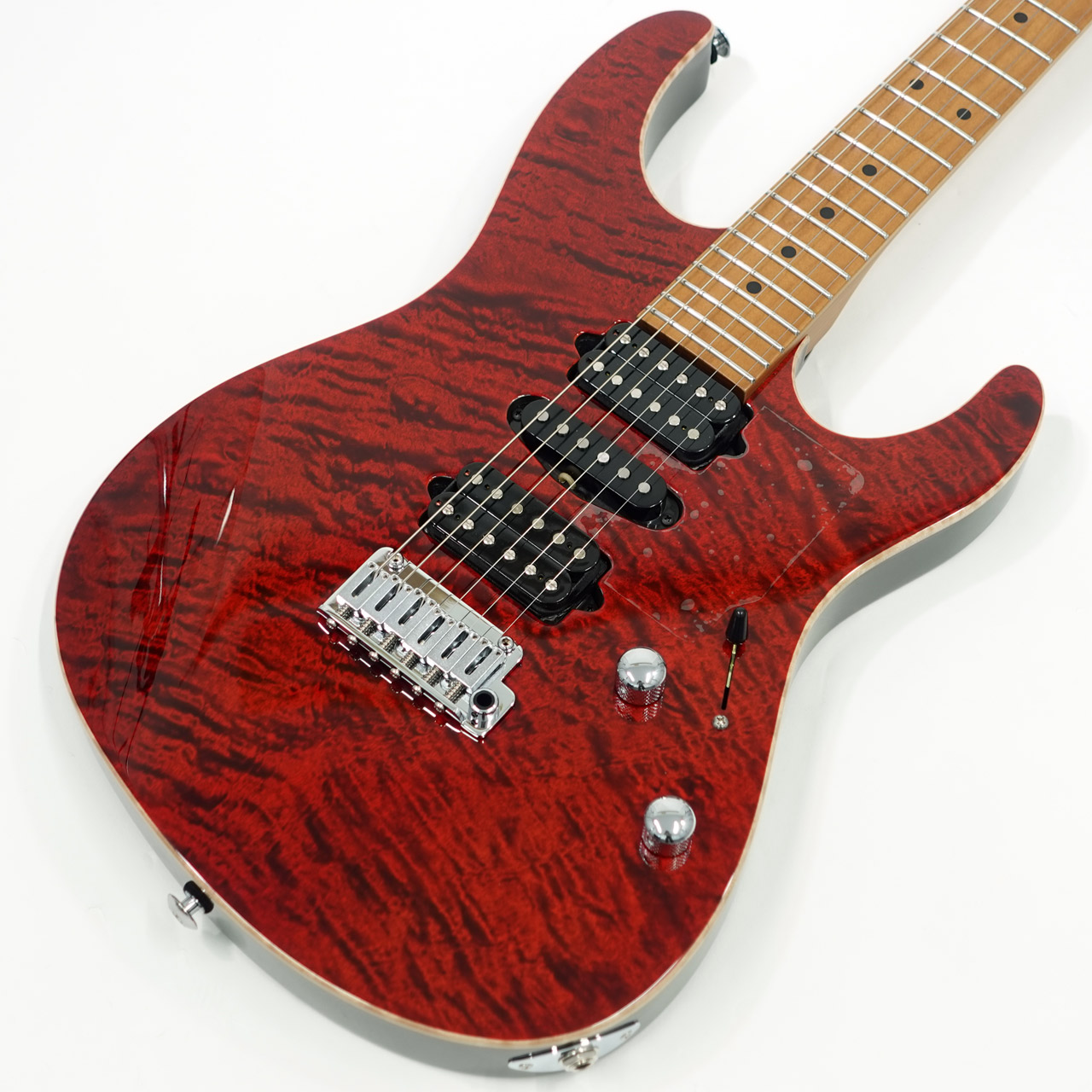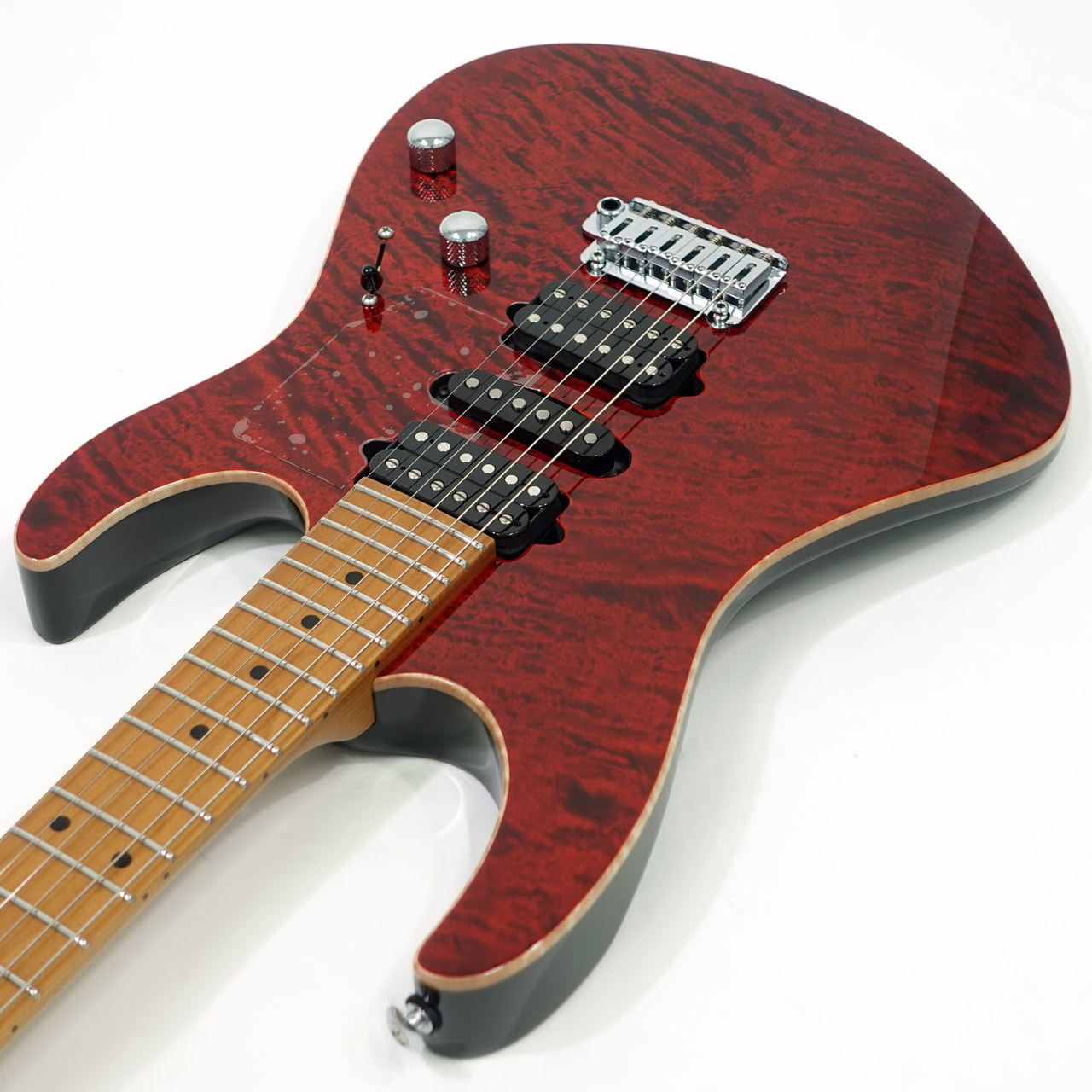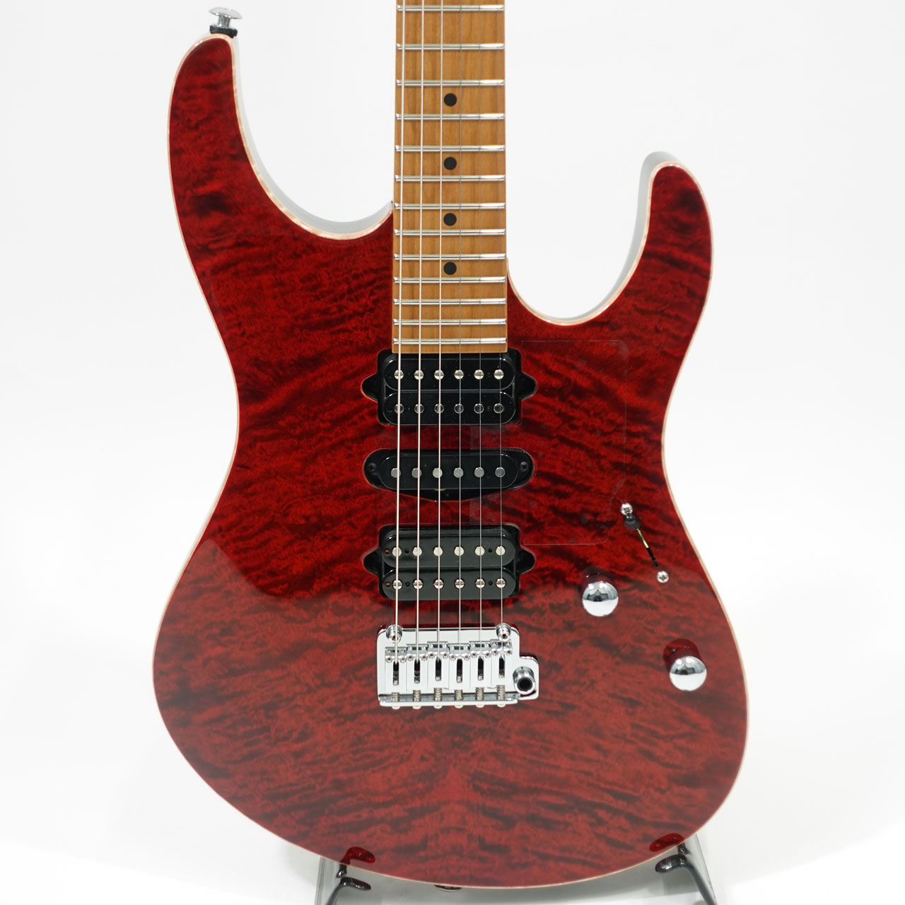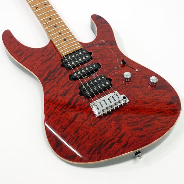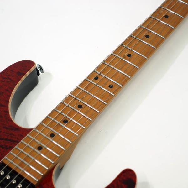 美しい杢目のフレイムメイプルトップ/バスウッドボディのコンビネーションに気温や湿度の変化に対する強い耐性、そして特有の鳴りも持ち合わせるローステッドメイプルネックを採用。指板にもローステッドメイプルを採用したコンパウンドラジアス仕様。