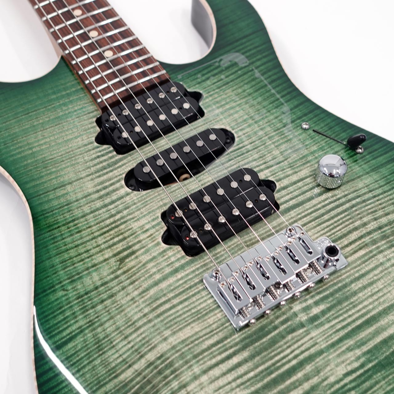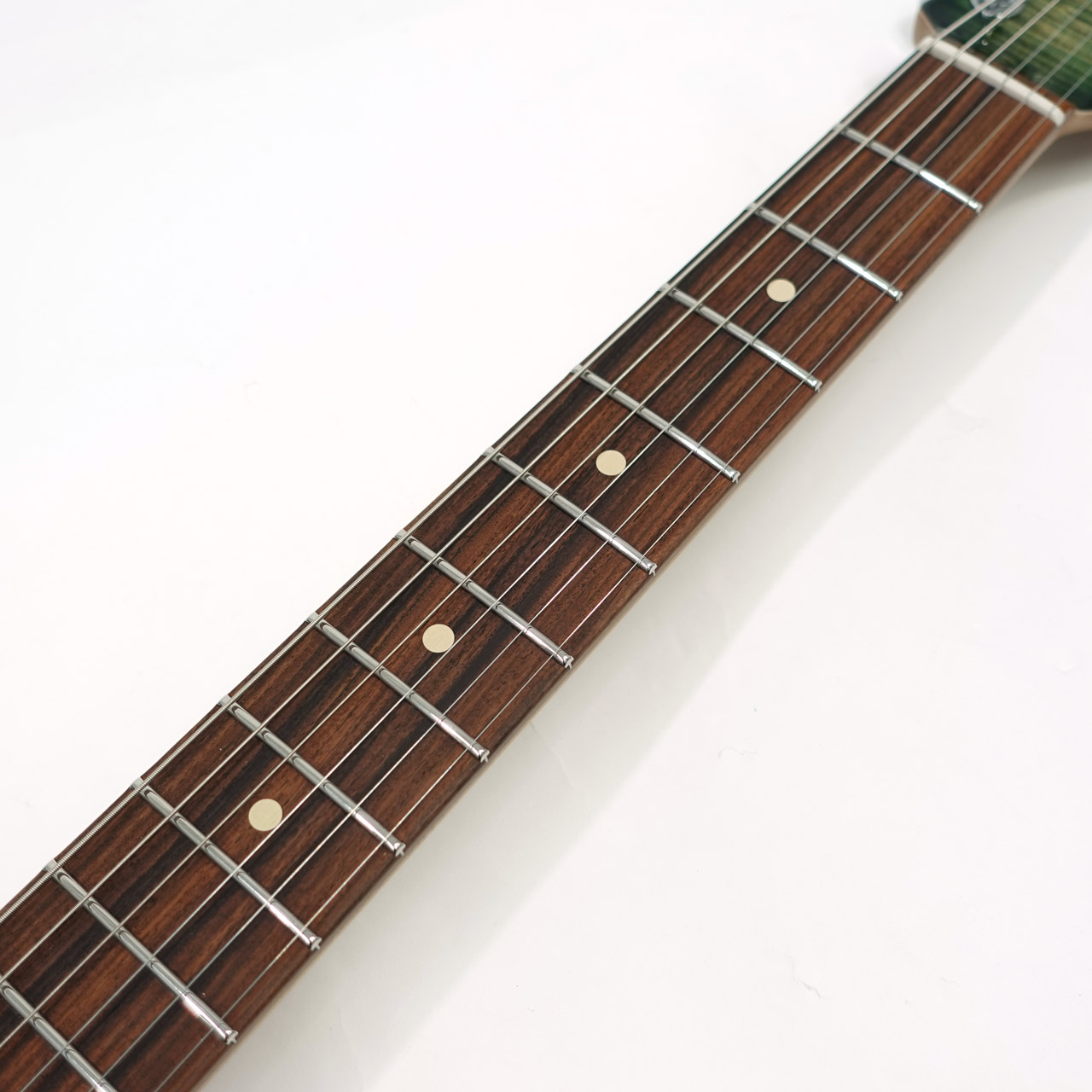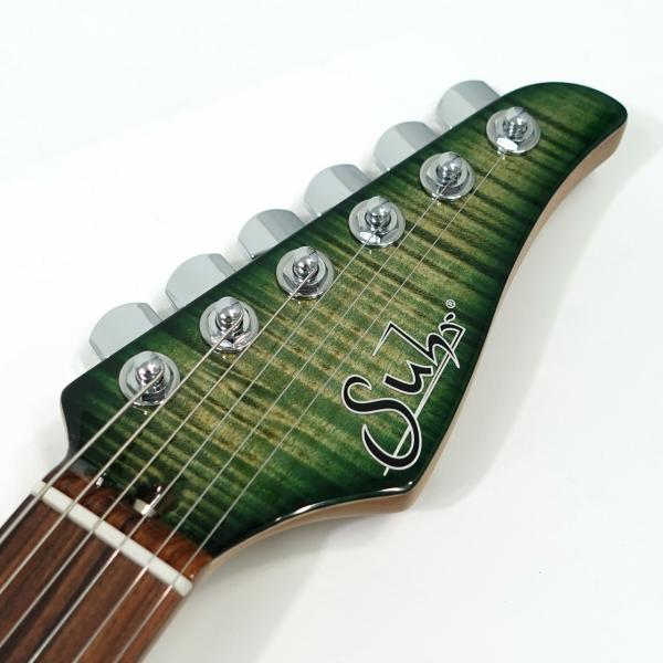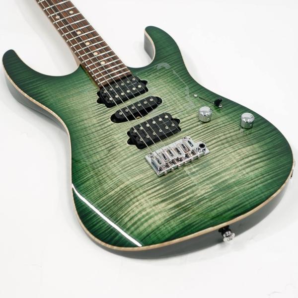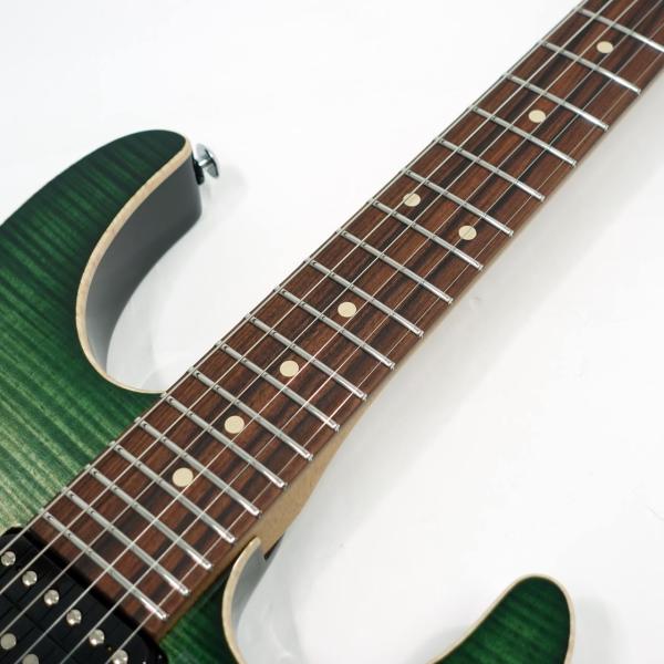 美しい杢目のフレイムメイプルトップ/バスウッドボディのコンビネーションに気温や湿度の変化に対する強い耐性、そして特有の鳴りも持ち合わせるローステッドメイプルネックを採用。指板にパーフェローを採用したコンパウンドラジアス仕様。