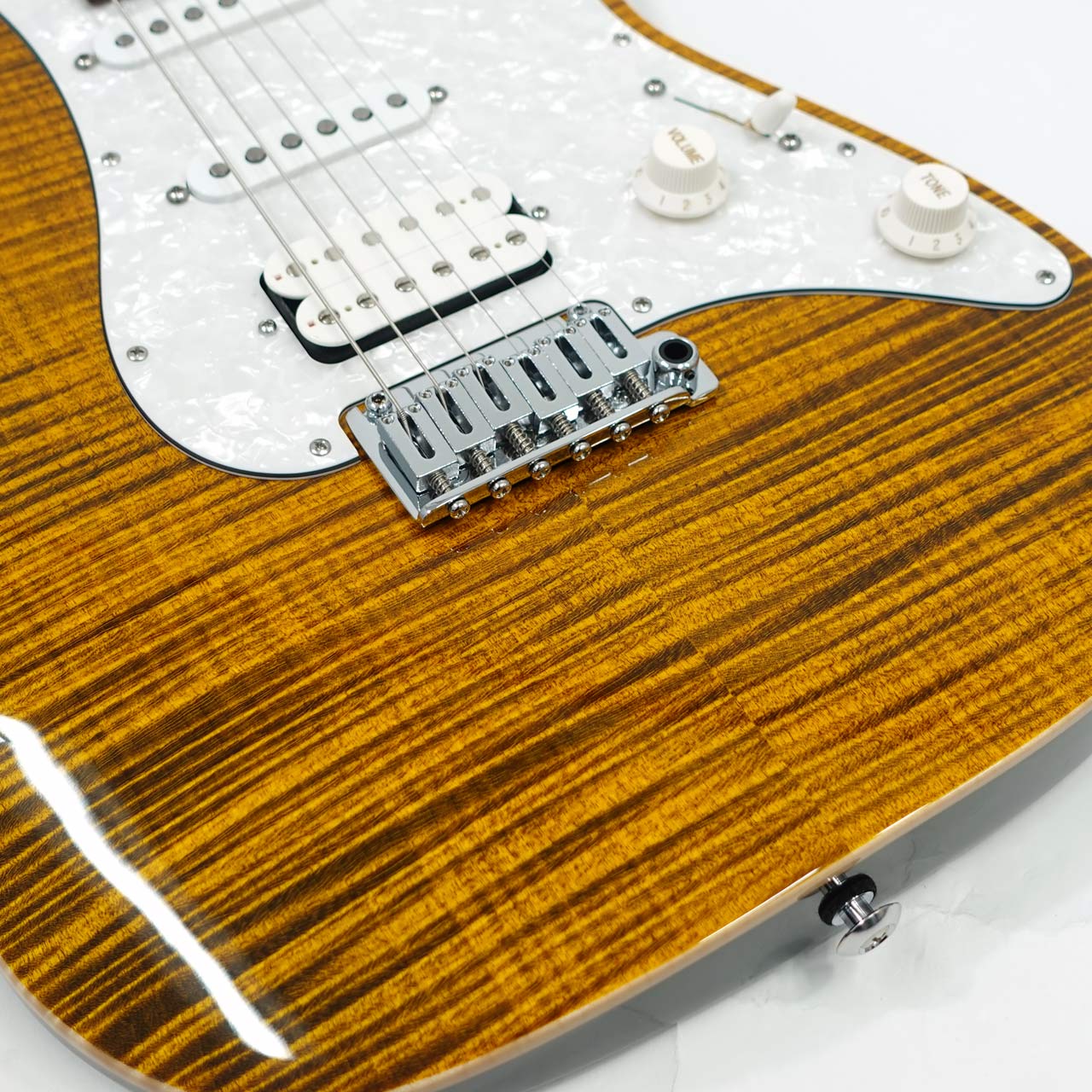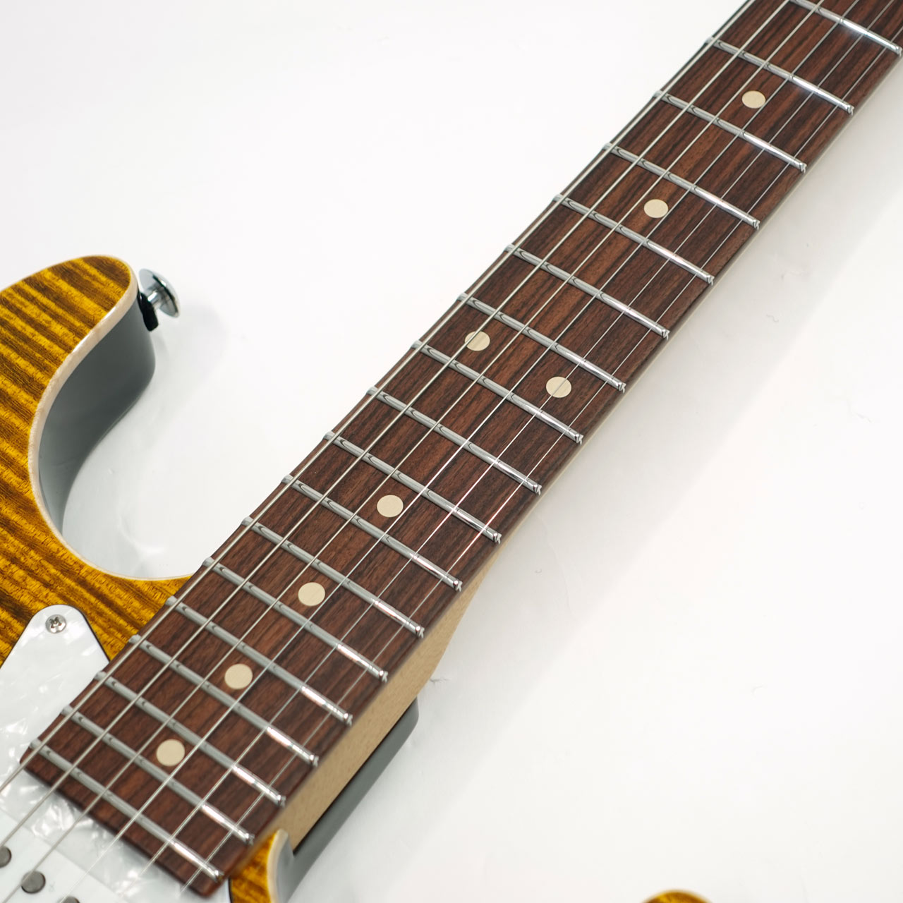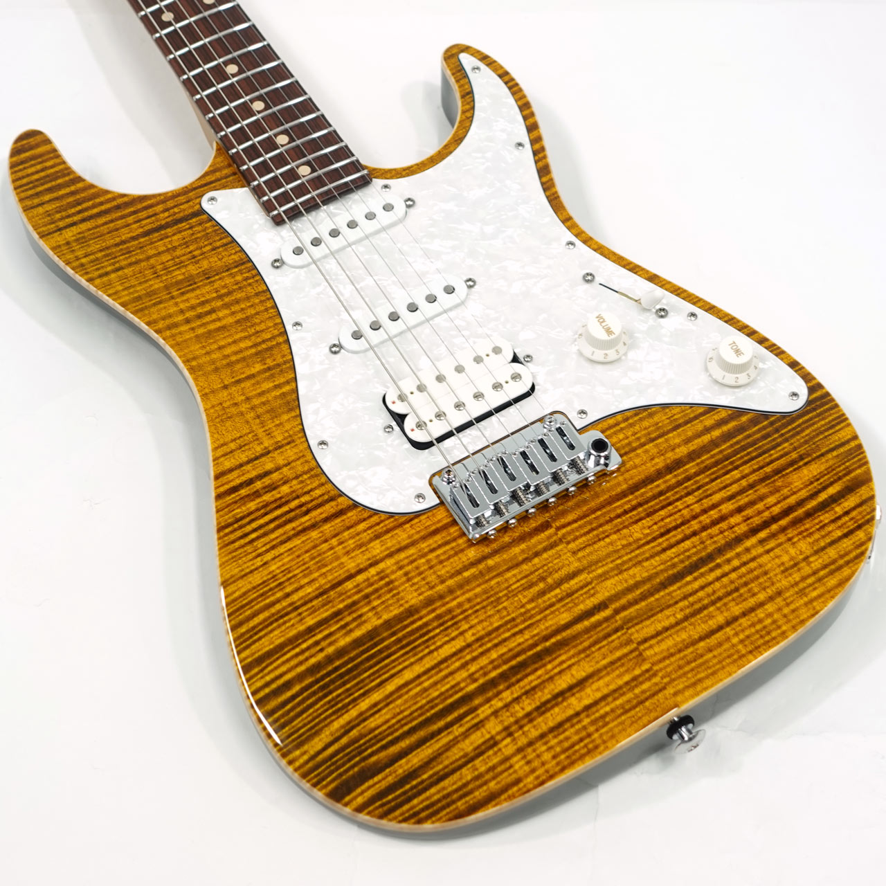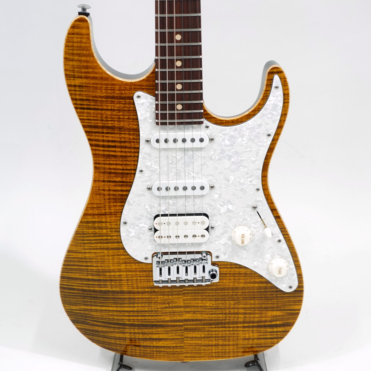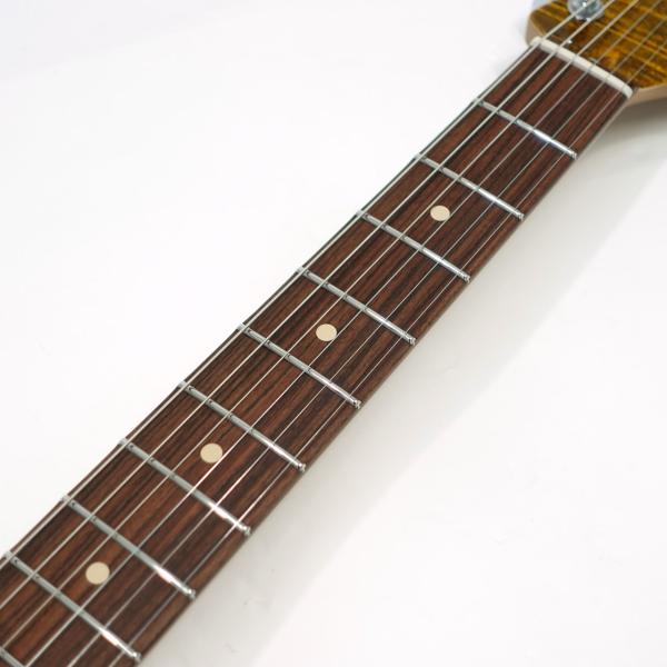 定番のフレイムメイプルトップ/バスウッドボディのコンビネーションに気温や湿度の変化に対する強い耐性、そして特有の鳴りも持ち合わせるローステッドメイプルネックを採用。指板にはパーフェローを採用したコンパウンドラジアス仕様。ヘッドストックにもフレイムメイプルトップをあしらったマッチングヘッド仕様です。