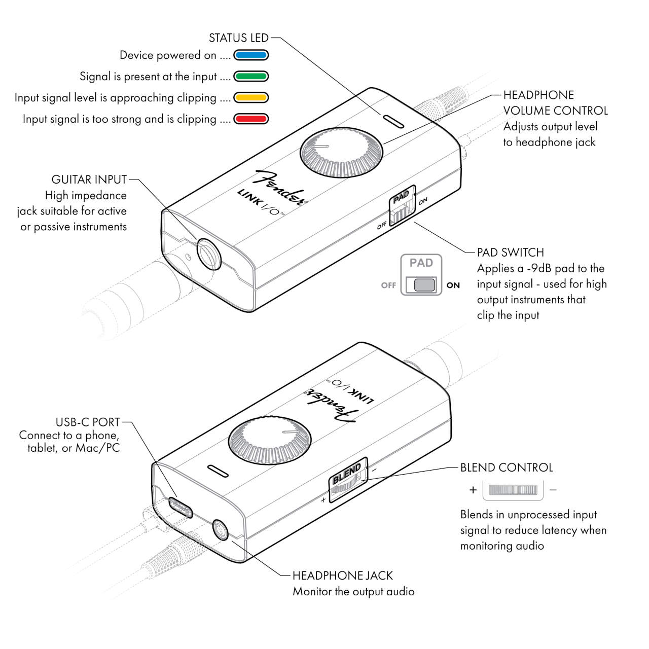 Fender Link I/Oは、フェンダーの世界的に有名なアンプのダイナミックレスポンスと妥協のない24ビット/96kHzオーディオを再現するように設計された入力段を備え、あらゆるパッシブ/アクティブ楽器からハイファイトーンをそのままデバイスに届けます。